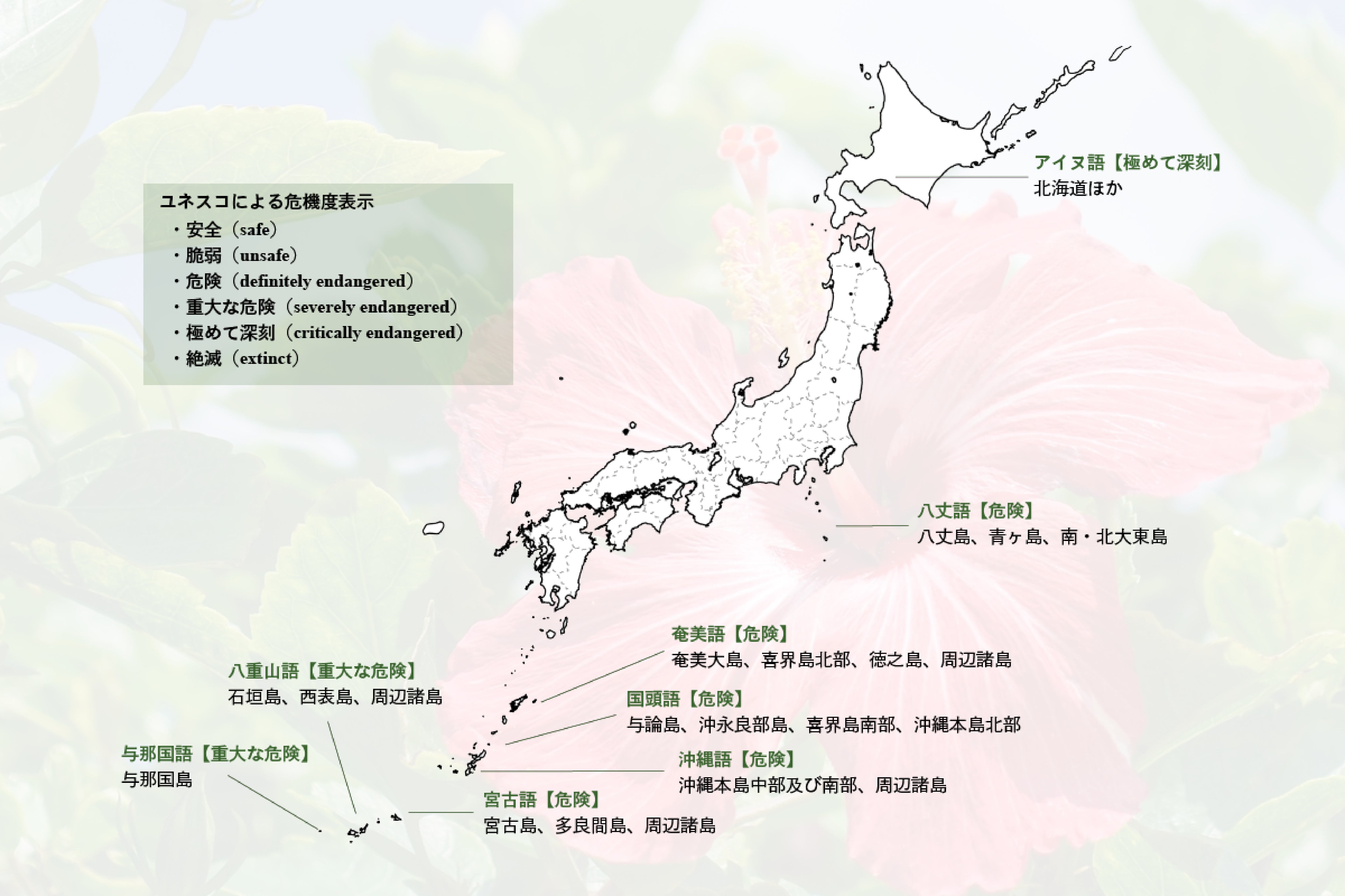 2009年2月に国連教育科学文化機関(UNESCO)が発表した”Atlas of the World’s Languages in Danger”(第3版)では、世界では約2,500の言語が消滅の危機にあるとし、日本語の中でも8言語が消滅の危機がある言語として掲載されています。