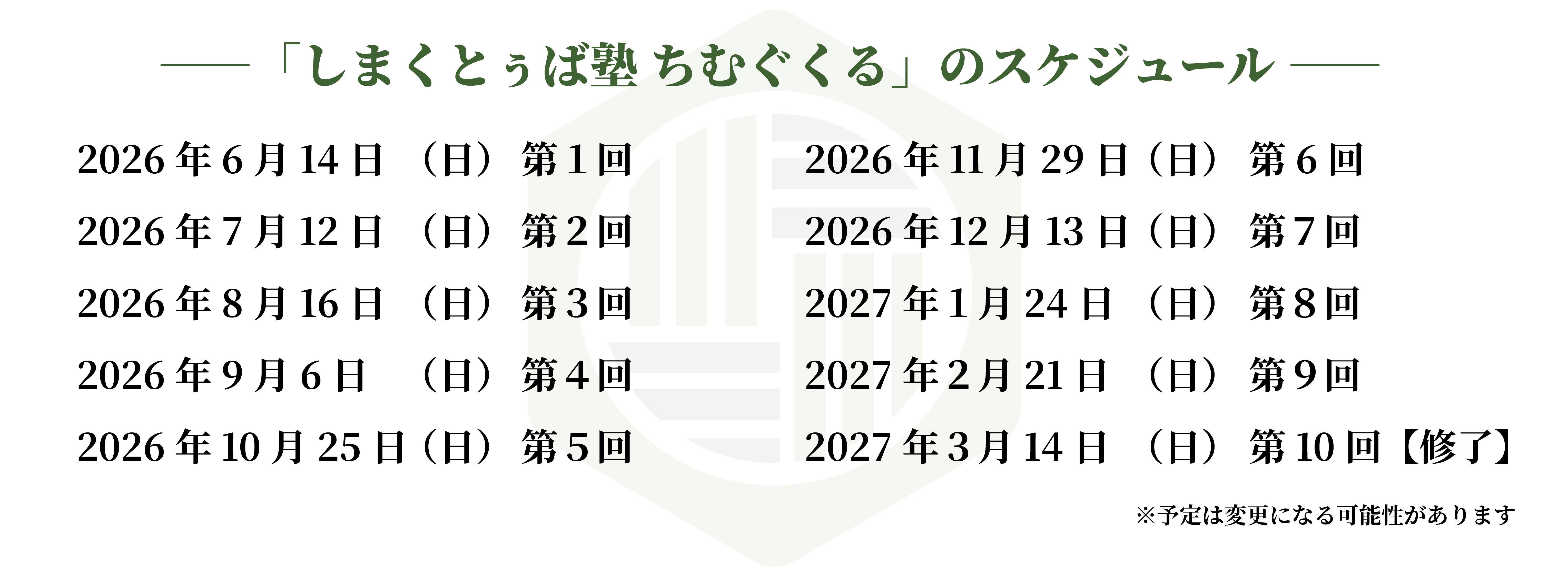 2026年6月から毎月1回、全10回の開催を予定しています。