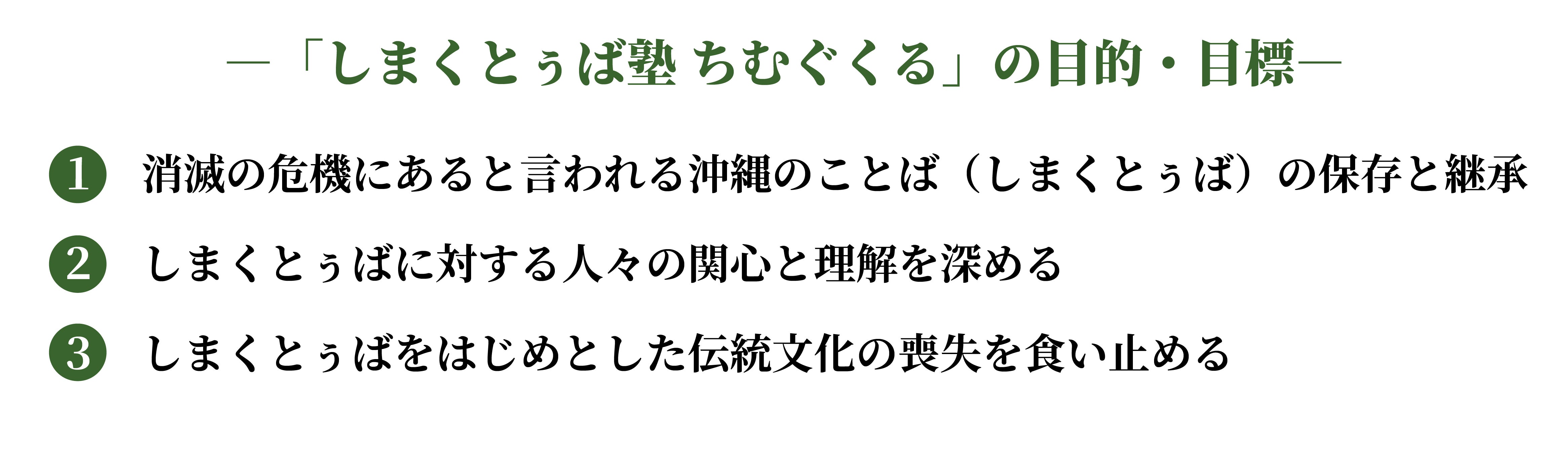私たちは次の3つの大きな目的・目標を実現するために、「しまくとぅば塾 ちむぐくる」を決して単発・短期間で終わらせることなく、長く継続していかなければならないと考えています。
