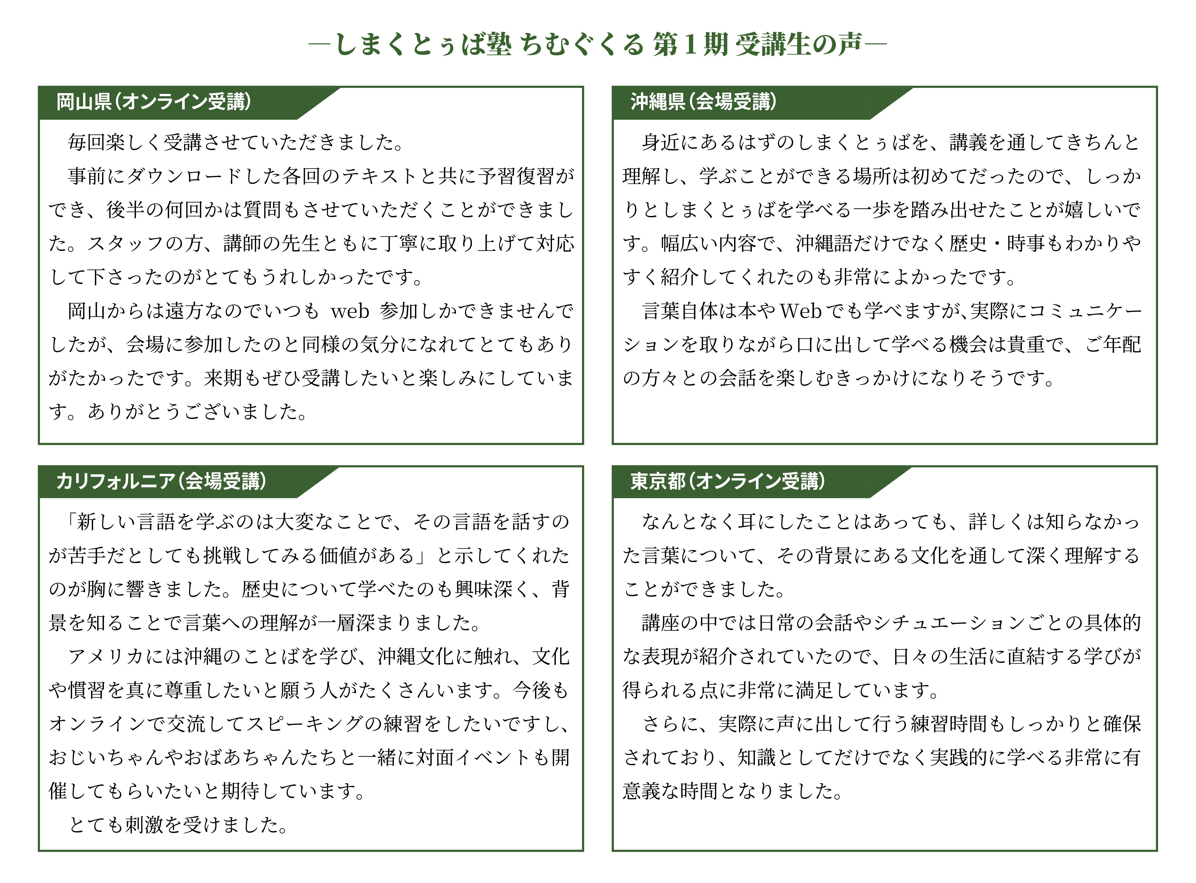 対面+オンラインで全国どこからでも受講可能なスタイルはそのままに、これまでの学びを土台としながら、より多くの方々が日常の中で「しまくとぅば」に触れ、使い、次の世代へと手渡していける環境を整えていきたいと考えています。