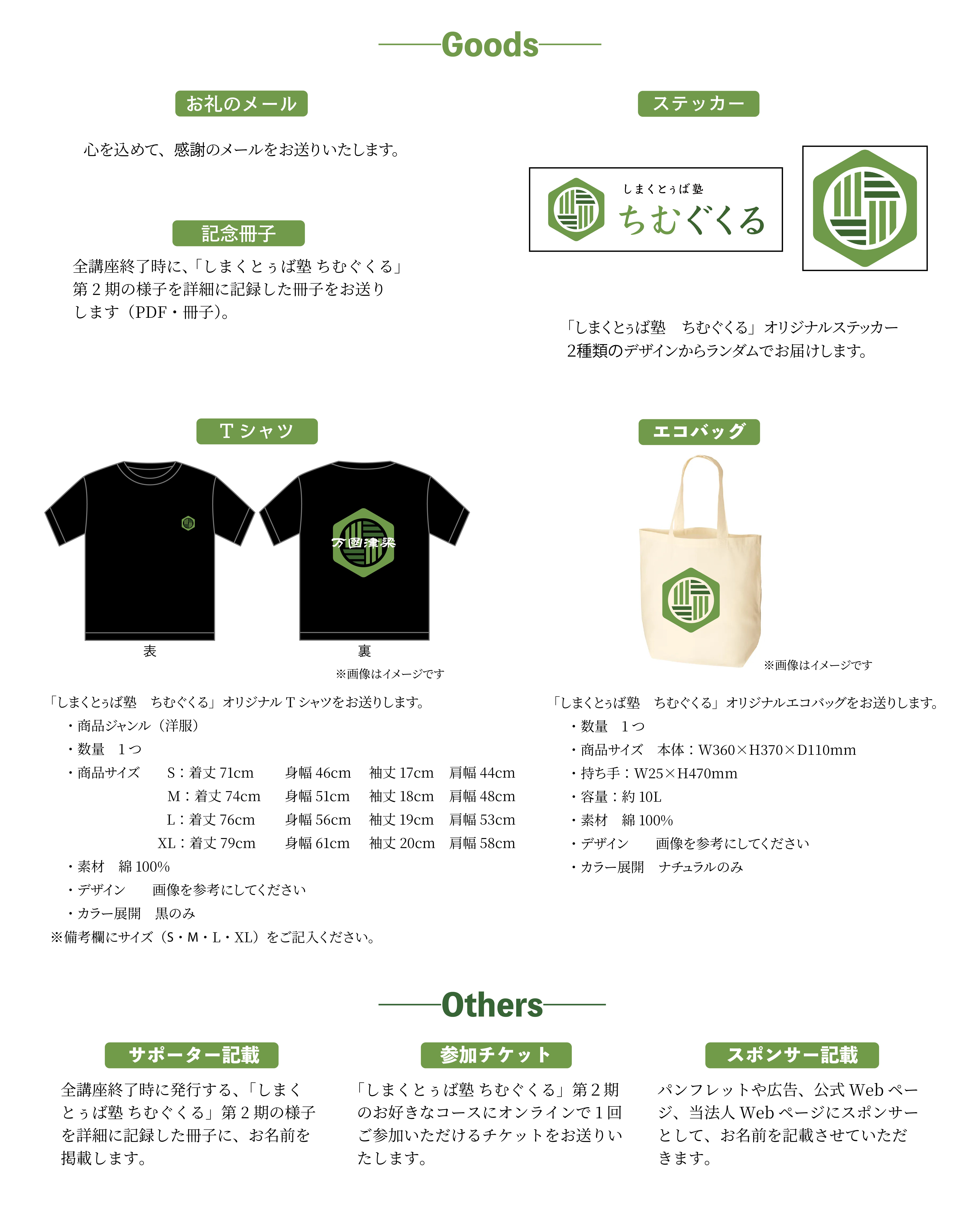 2026/04/18 15:03クラウドファンディングも9日目となりました。残り2週間弱、こちらの活動報告ではこのプロジェクトやしまくとぅば塾 ちむぐくるについての情報を引き続き更新していきますので、皆さまぜひ、ご支援・応援のほど、よろしくお願いします!さて、今回はクラウドファンディングリターンとしてご用意しているグッズのご紹介です。しまくとぅば塾 ちむぐくるロゴステッカー しまくとぅば塾 ちむぐくるのロゴを配したステッカーです。 私たちはしまくとぅば塾 ちむぐくるの活動を通して沖縄の伝統を大切にしつつ、世代間・地域間の分断ではなく協調・共生を目指していきます。 そのため、六角形のロゴには平和や調和を意味する緑色をベースに、鉛筆の形をイメージしつつ自然界の秩序や安定、調和を表す六角形の中に、沖縄で古くから魔除けとして生活に根付いた模様「ヤシラミ」を取り入れたデザインを採用しています。オリジナルTシャツスタッフTシャツとしても採用しているデザインのTシャツをお届けします。フロントは左胸部分にステッカーと同じロゴを、バックプリントにはロゴとともに「万国津梁」の文字を刻んでいます。「万国津梁」かつて琉球王国が掲げたこの言葉は、沖縄の地理的・歴史的特性を象徴し、「架け橋」としての精神を表しています。そこには多様性と共生の理念を持って世界と向き合おうとする沖縄の強い意思が込められ、現代の沖縄においてもなお、大切な価値として息づいています。▼「万国津梁」についての解説はこちらhttps://www.okinawa.bunkaju.jp/gallery/827/オリジナルエコバッグ前回ご支援いただいたクラウドファンディングのリターンとして制作した際、好評をいただいたものです。サイズは本体がW360×H370×D110mm、持ち手部分がW25×H560mm、容量が10Lになります。我々運営スタッフも普段から愛用しております。自分で言うのはちょっと気が引ける部分もありますが、便利です。第2期記録冊子他にも、講座終了後にWeb掲載する講座レポートとは別に、第2期の講座の様子・内容を記録した記念冊子の発行を予定しています。この冊子には「応援+記録コース」「応援+記録+参加コース」「サポーター」「未来創造サポーター」「共創パートナー」をお選びいただいた方のお名前を掲載させていただきたいと考えております。※コースに応じてPDF / 冊子でお届けします。ご興味のあるものがありましたらグッズのリターンをお選びください。また、「こんなものがあれば良いのに……」というアイディアがある方はぜひご連絡いただければ嬉しいです。前向きに前のめりで製作を検討します!ぜひ、このプロジェクトをご友人やお知り合いの方にも広めていただけますと幸いです。残り2週間弱とはなりますが、皆さま引き続きよろしくお願いいたします! もっと見る