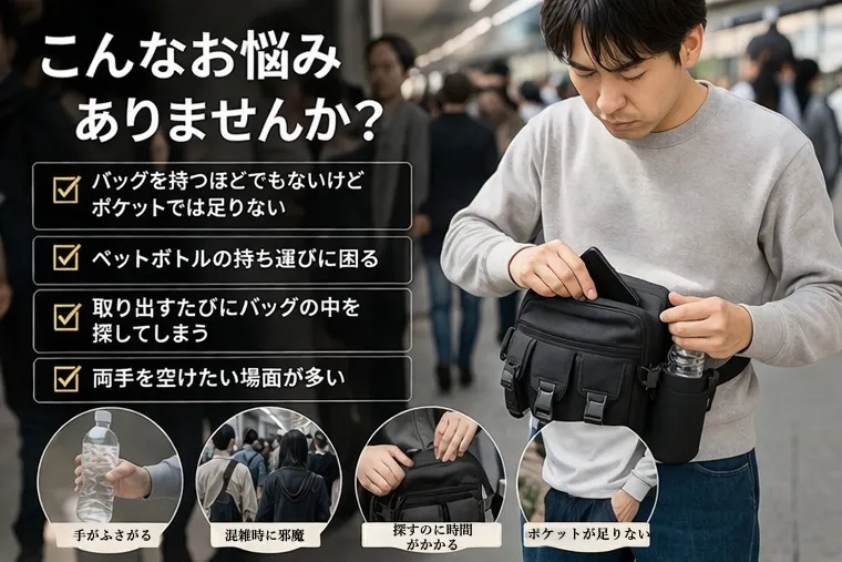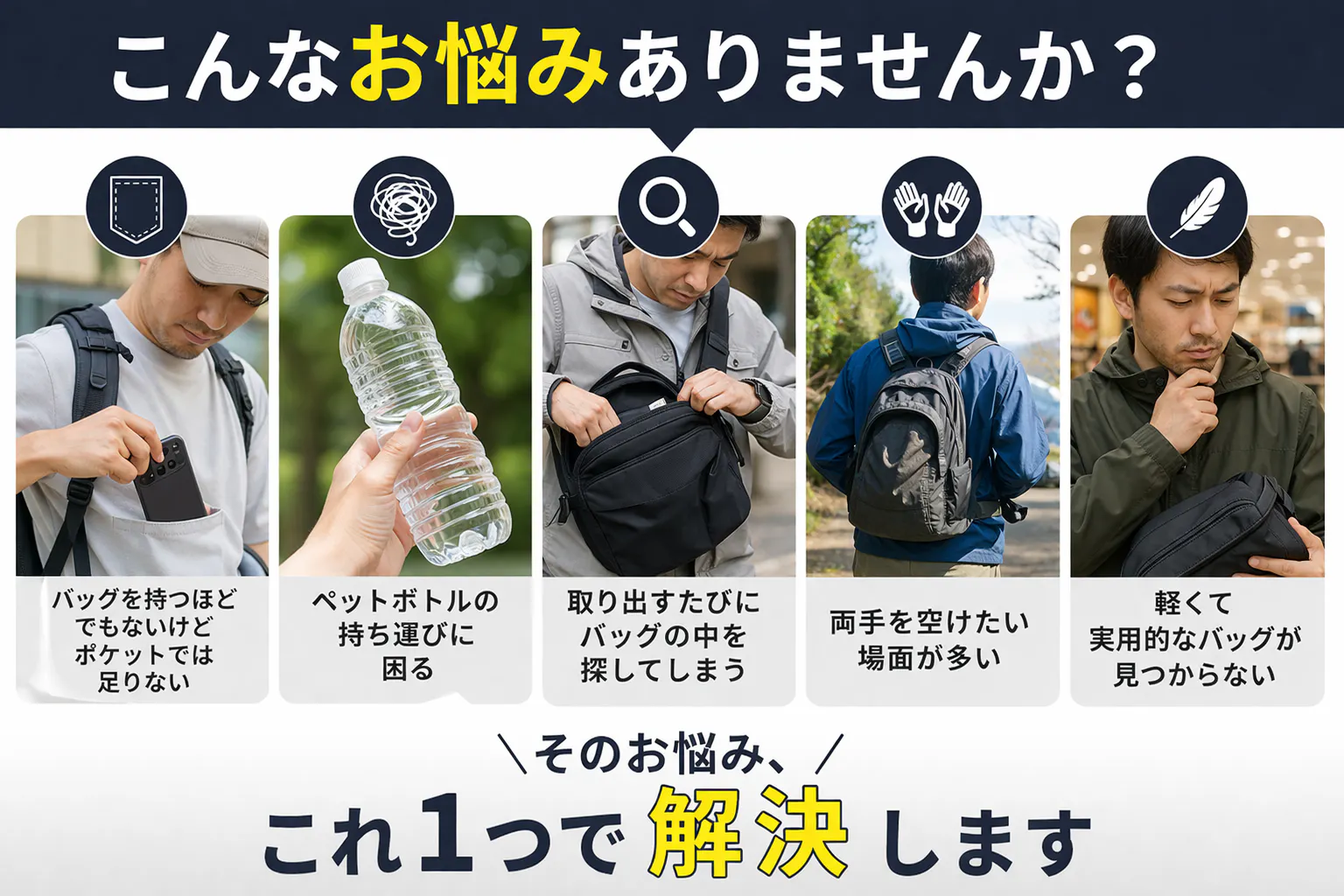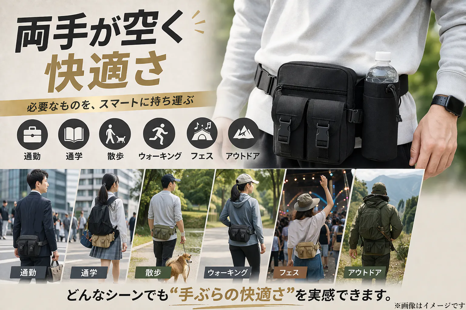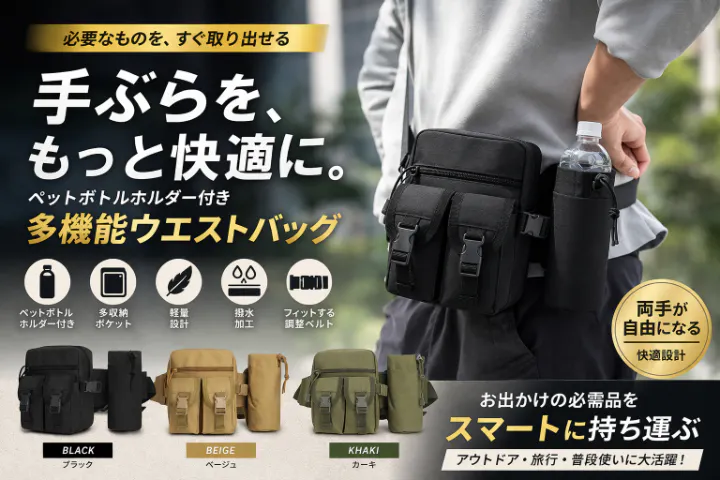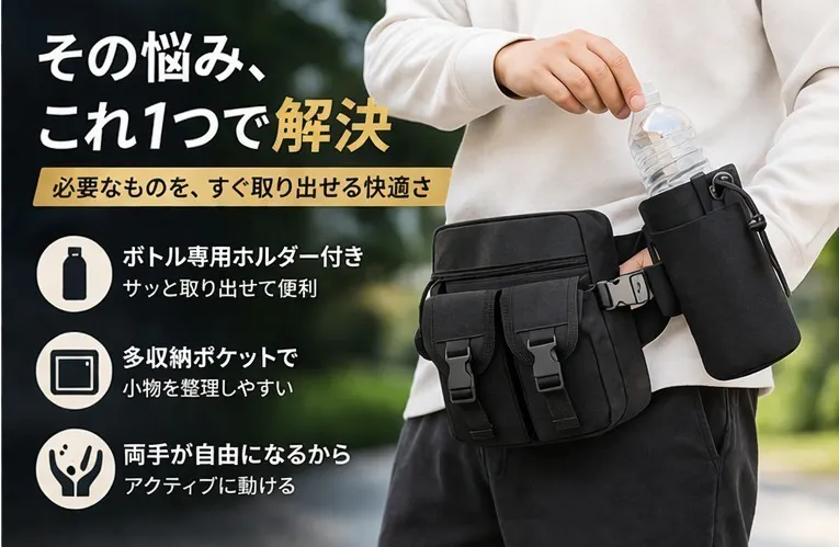 外出時、バッグは持ちたくない。でも水分と必要最低限の持ち物は必要。そんな悩みを解決するのがこのウエストバッグ。ペットボトル専用ホルダー付きで、片手で取り出せる設計。財布・スマホ・鍵をまとめて収納し、手ぶらで快適な外出を実現します。
