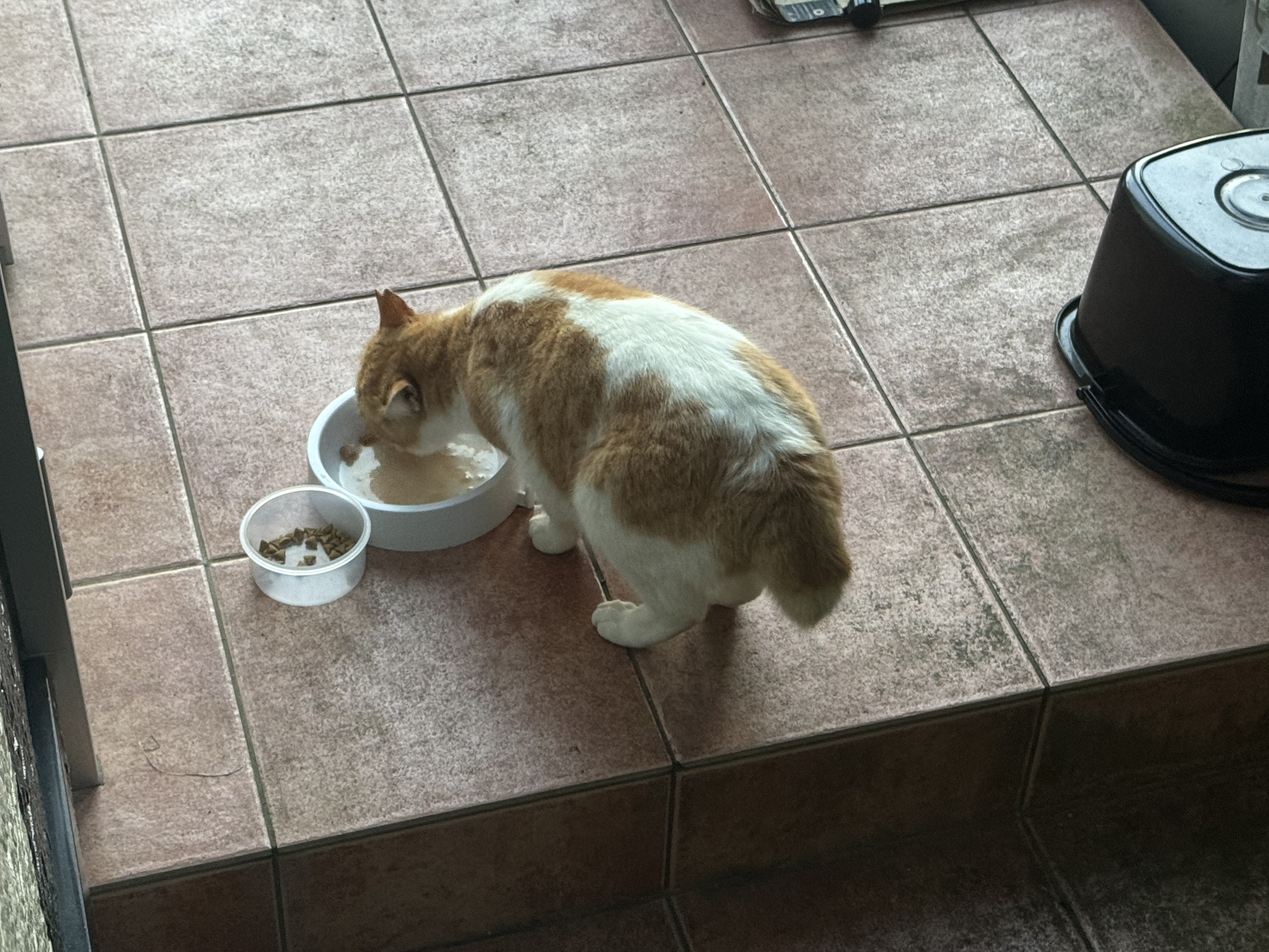 外猫のチーズが朝早くからやって来てました。1回目は3時、さすがに私も寝てました。2回目に5時過ぎに来てくれました。