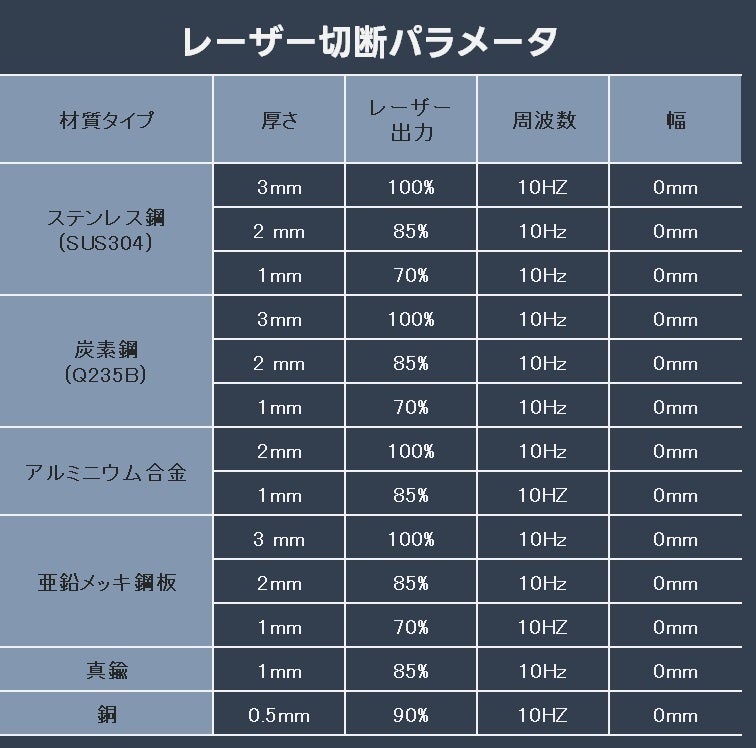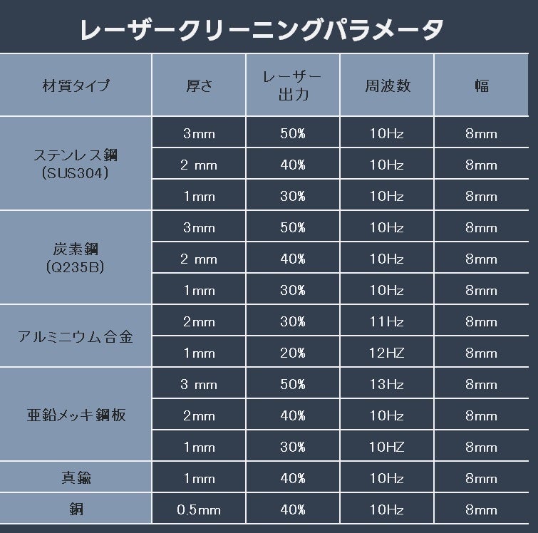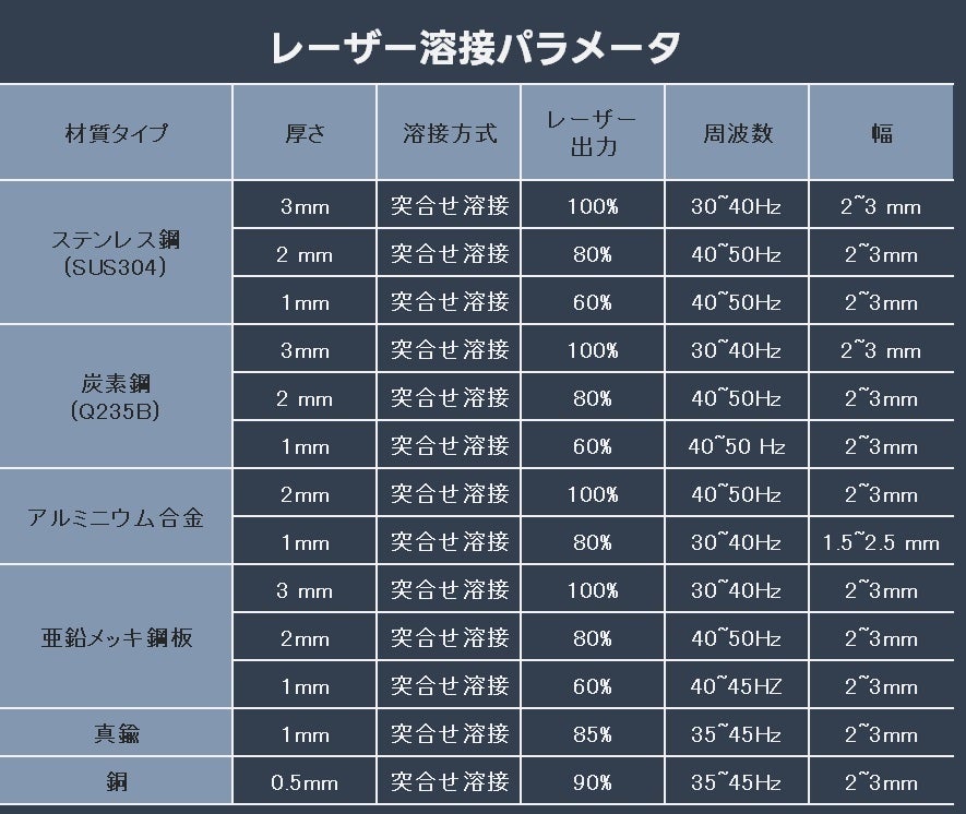 (注:溶接プロセス(空気圧、作業速度、焦点ずれ度合い、溶接角度など)はお客様によって異なるため、提供データは参考値としてお考えください。)
