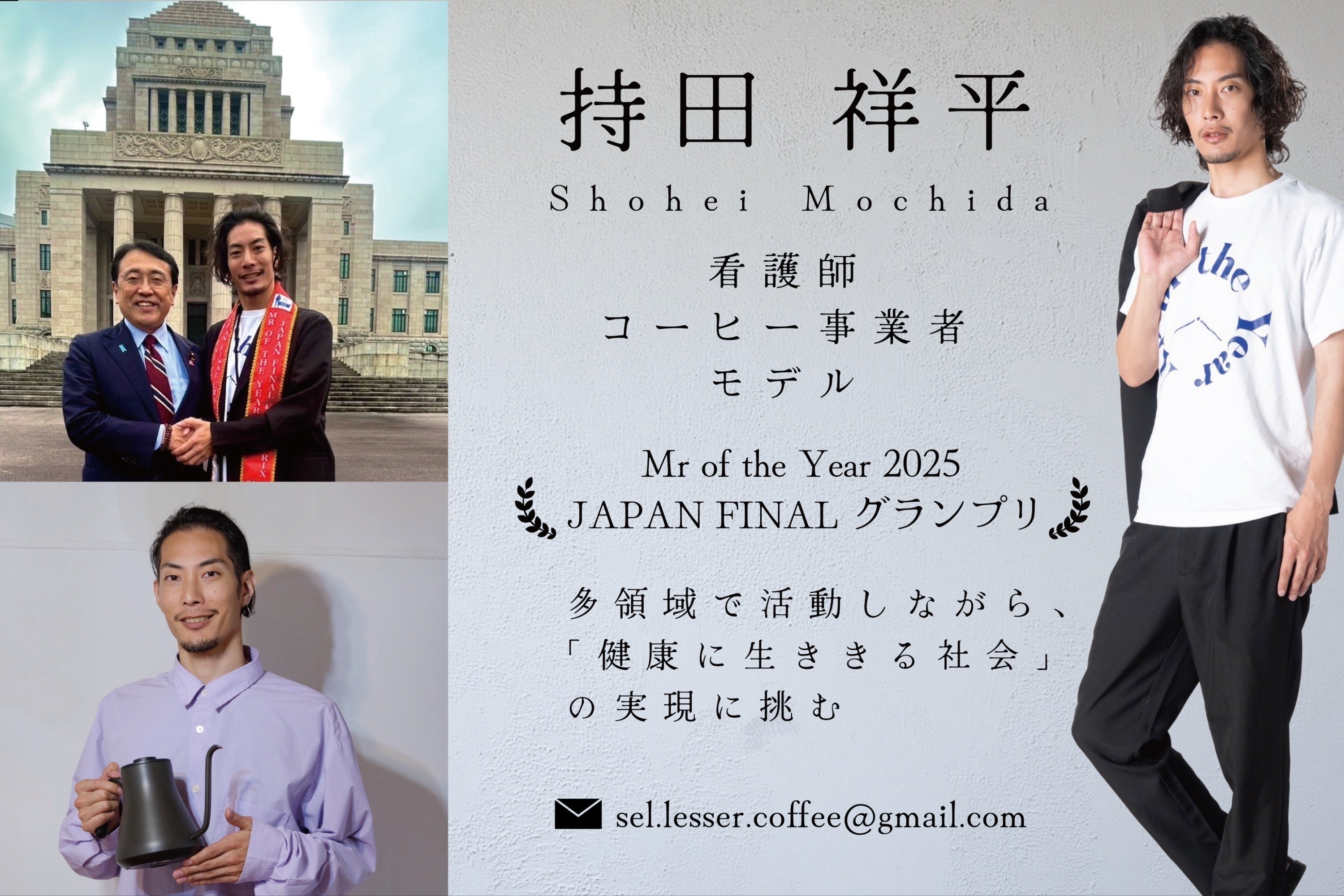 若き日、スポットライトに憧れた彼が選んだのは、人を元気にし、健康にし、命を預かる看護師という仕事でした。そして今、新たな使命を見つけました。コーヒーで人を笑顔にし、健康に生ききる社会をつくること。熱い想いを胸に、最愛の妻に支えられながら、コーヒー屋へと転身。その情熱はとどまることなく、Mrs & Mr of the Year WORLDへの挑戦を決意しました。目指すは、世界一。この挑戦を、どうか一緒に後押しください。