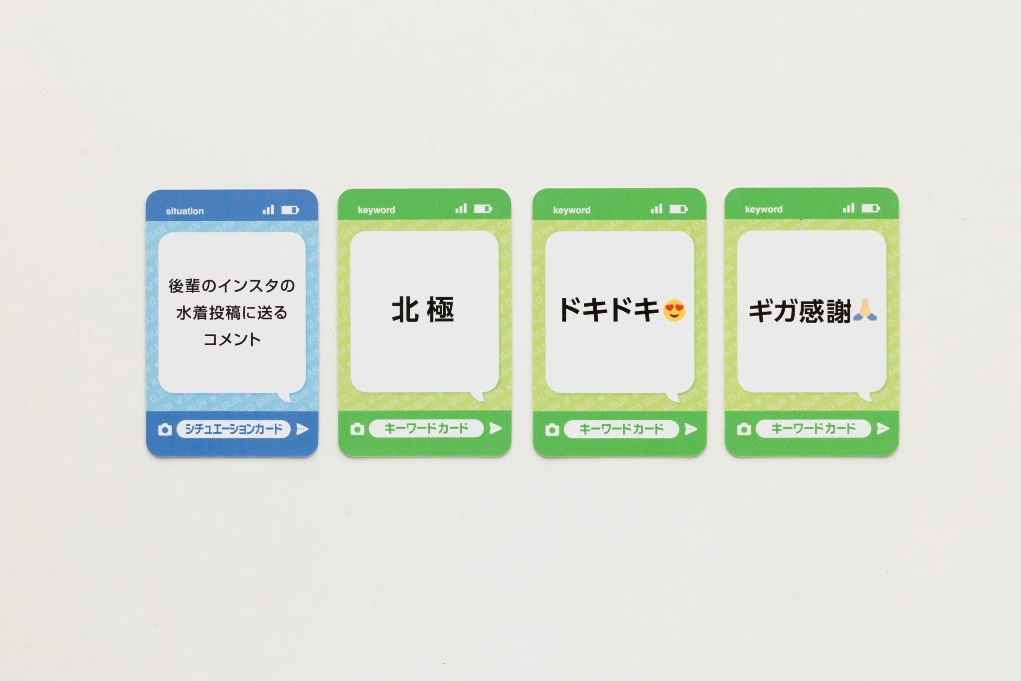 シチュエーションカードとキーワードカードを組み合わせて、即興で文章を作ります。