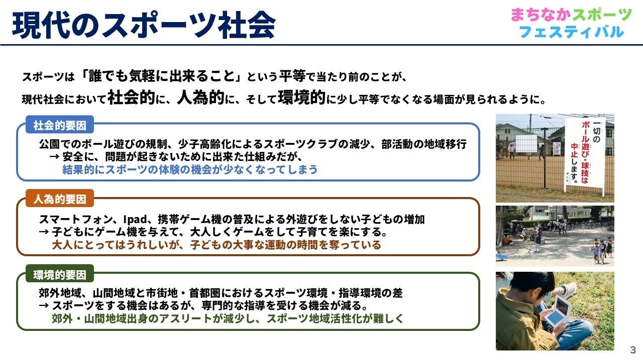 公園でのボール遊びの禁止、少子高齢化によるスポーツクラブの減少、スマホやゲーム機の普及による外遊びの減少…。