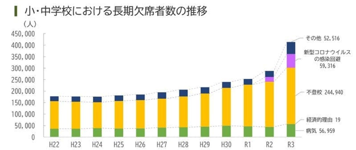 ・不登校総数(小中): 353,970人(前年度から7,488人増加)