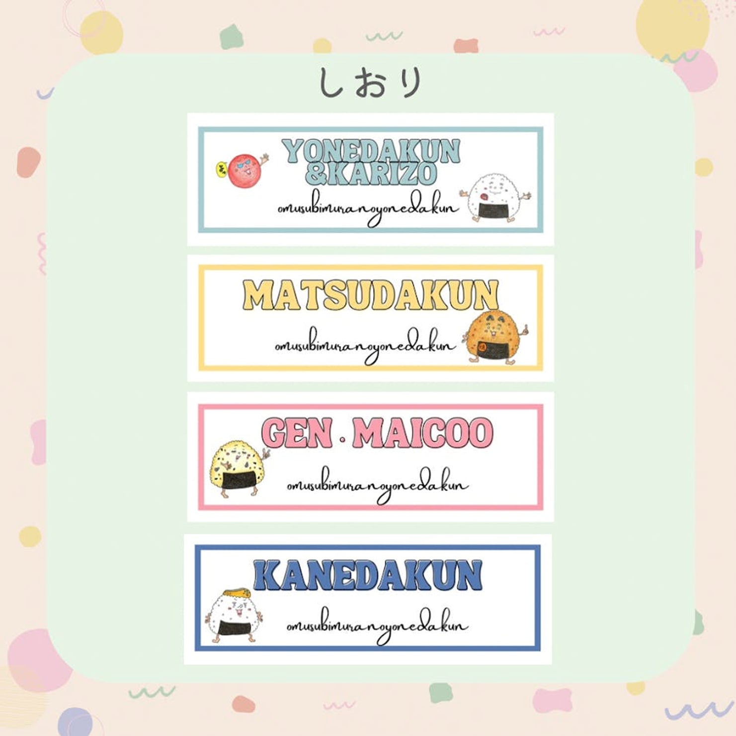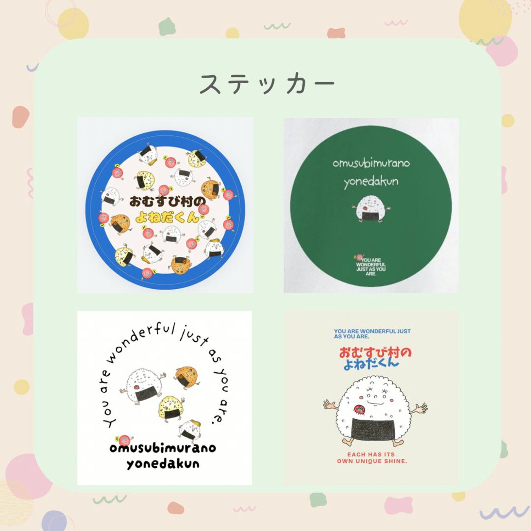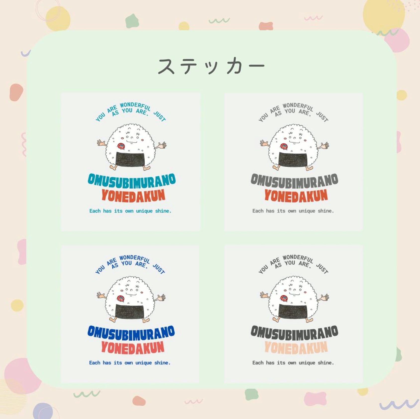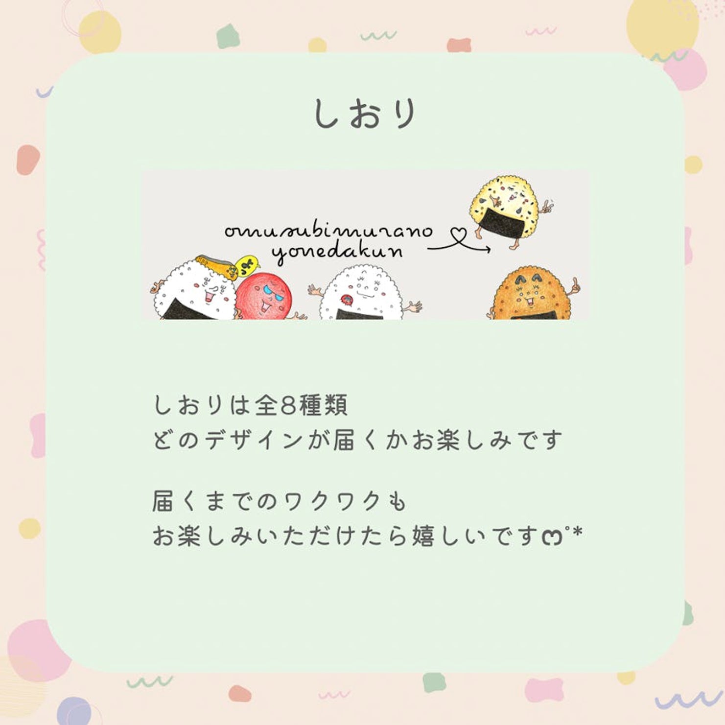 ここでしか手に入らない限定ステッカー。おむすび村の仲間たちが日常に小さな笑顔を届けます。ガシャポンみたいなワクワクをお届けしたくて、どのデザインが届くかは届くまでのお楽しみ。ワクワクしながら待っててもらえたら嬉しいです。