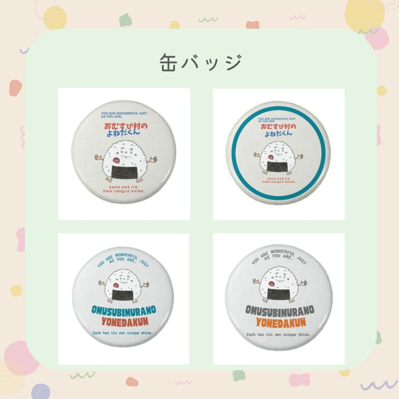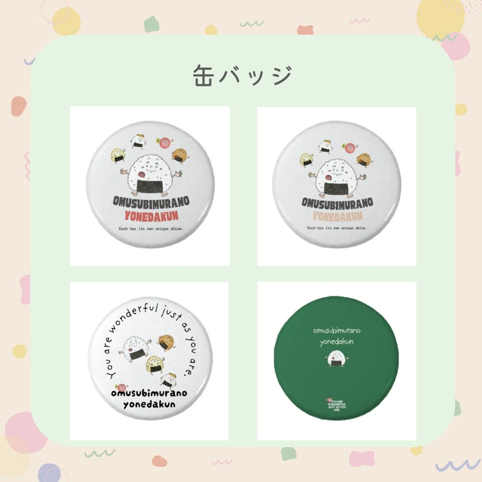 おむすび村のキャラクターがかわいい缶バッジに。 バッグやポーチにつけて、いつでもおむすび村と一緒です。ガシャポンみたいなワクワクをお届けしたくて、どのデザインが届くかは届くまでのお楽しみ。ワクワクしながら待っててもらえたら嬉しいです。