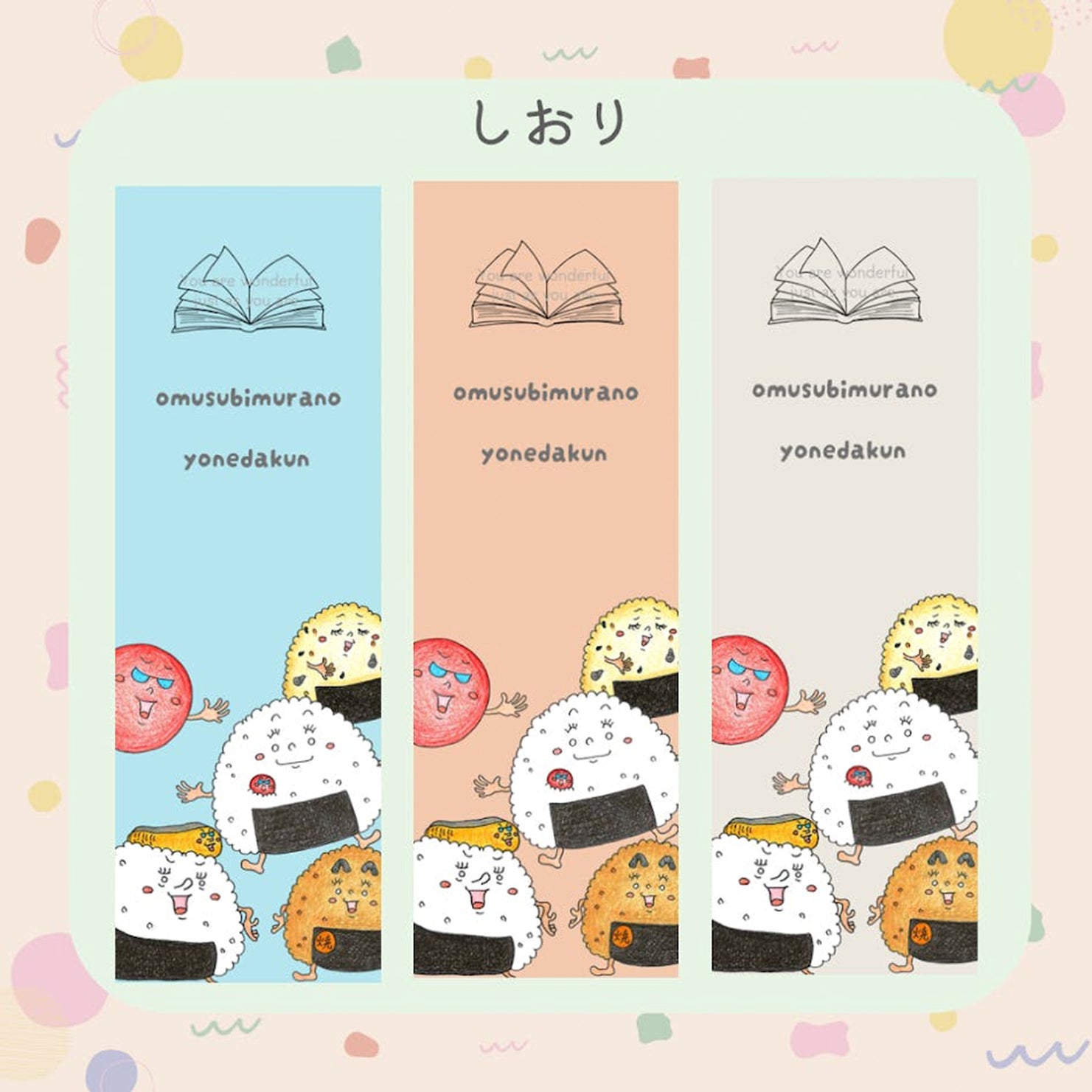 ポストカードは、お部屋に飾るとおむすび村のキャラクターたちが、まるでそこにいるかのようにあなたの日常を楽しく彩ってくれます。 しおりは、本のページをめくるたびに、かわいいおむすび村の仲間たちの笑顔にほっこりします。
