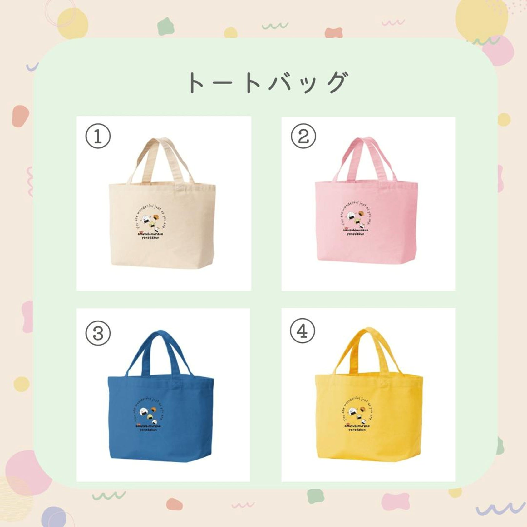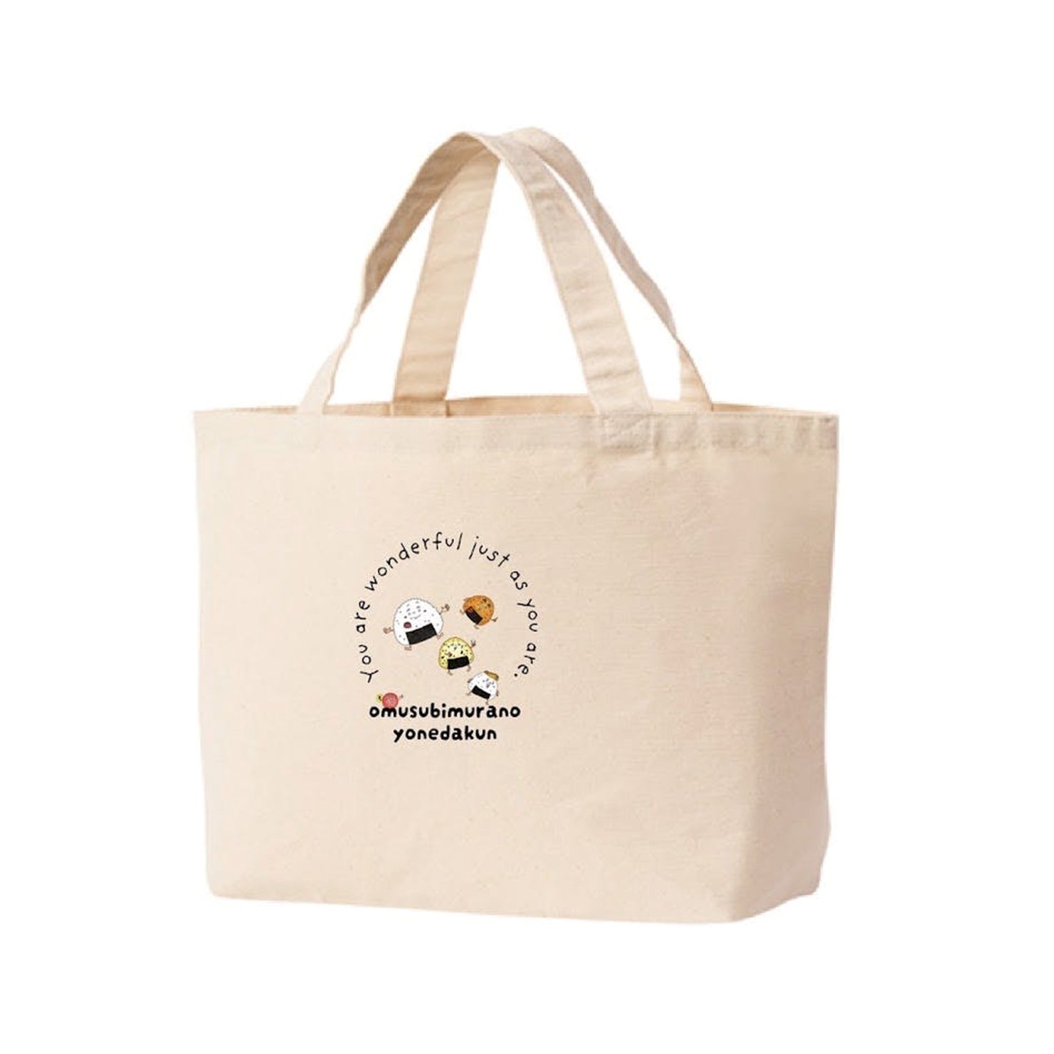 おむすび村のキャラクターが描かれたかわいいオリジナルトートバッグ。