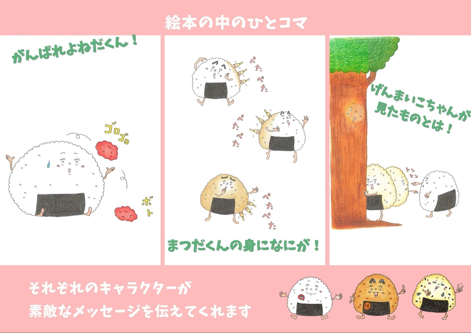 物語には、みそ焼きおむすびのまつだくん、玄米ご飯のげんまいこちゃんなど、性格も個性も違う様々なキャラクターが登場します。みんな違ってみんな大切。みんな違ってみんな素敵。そのメッセージが、読者の心にそっと寄り添い、自然と【そのままの自分でいいんだ】と感じてもらえるような絵本を目指しています。