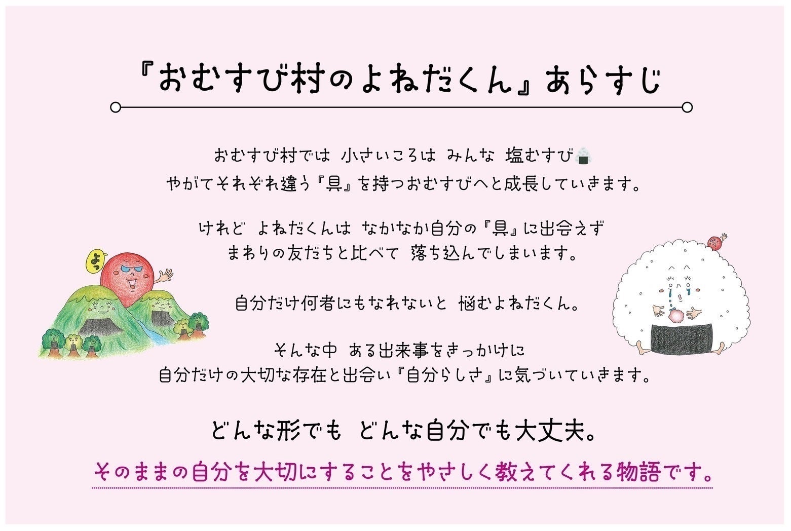 『おむすび村のよねだくん』は、一人ひとりの個性を【おむすびの具】にみたてた物語です。おむすび村では、みんな小さい頃は塩むすびですが、成長するとそれぞれ違う具材が現れます。なかなか具材が現れず悩むよねだくん。梅干しをまねてみても失敗し、泣きながら歩いていたよねだくんのお腹がほんわかあたたかくなった時、自分にしかない【カリぞう】という具材が出てくるのです。