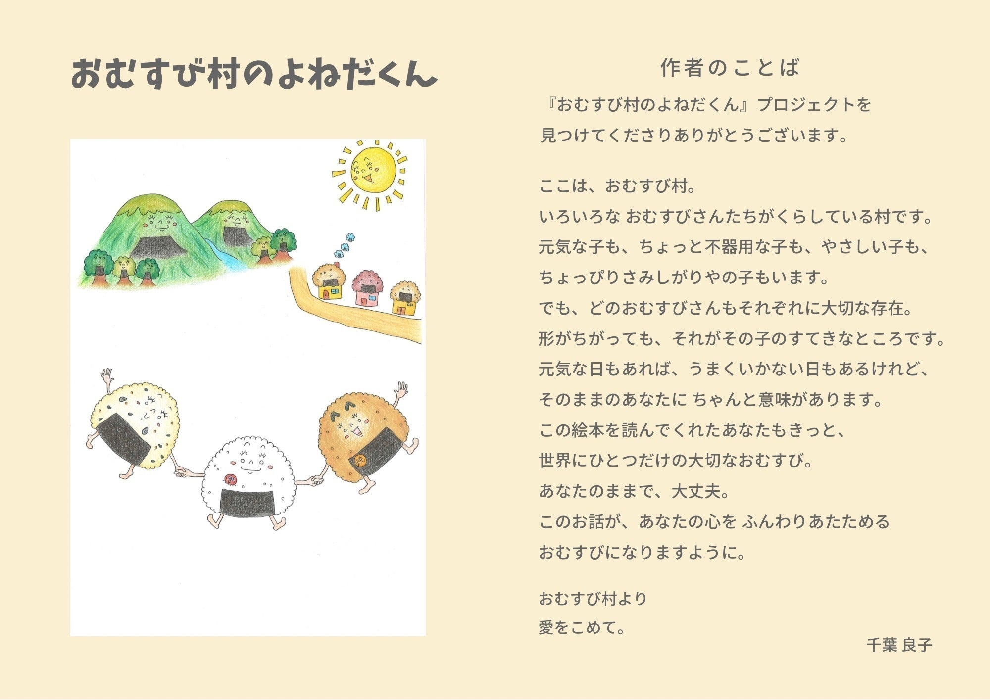 そういった方たちが、【大丈夫】と、安心できるきっかけとなる絵本をつくりたい!と思い『おむすび村のよねだくん』プロジェクトを決意しました。