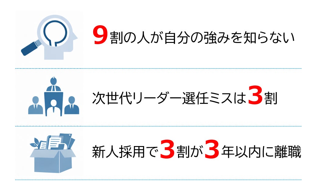 新卒採用や中途採用、次世代リーダー候補や後任者の昇格、人事異動などにおいて、多くの判断は一定の精度で行われています。実際、全体の約7割は大きな問題なく機能していると考えられます。
