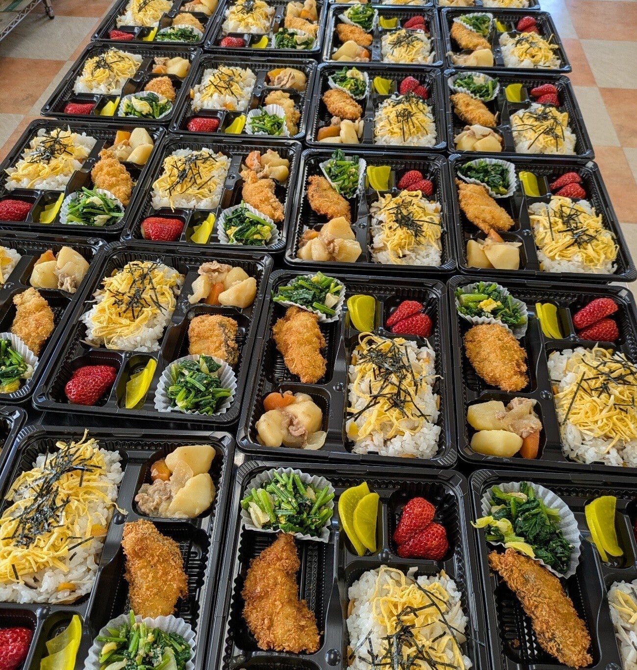 地域の見守り活動として、月2回、調理ボランティアさんが心を込めて手作りしたお弁当を、民生児童委員の方が一人暮らしの高齢者宅を訪問して、安否確認を兼ねて直接手渡しています。心のこもった温もりのあるお弁当は、受け取られた方に大変喜ばれています。