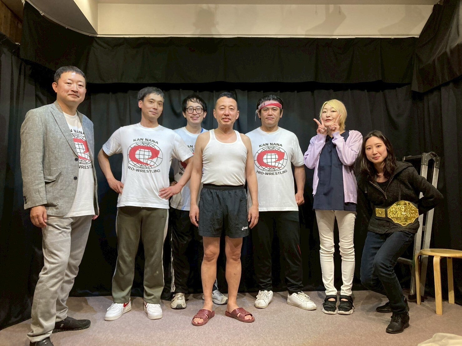 チャンピオンベルトを巻く上原プロデューサー。(ちゃめっ気)