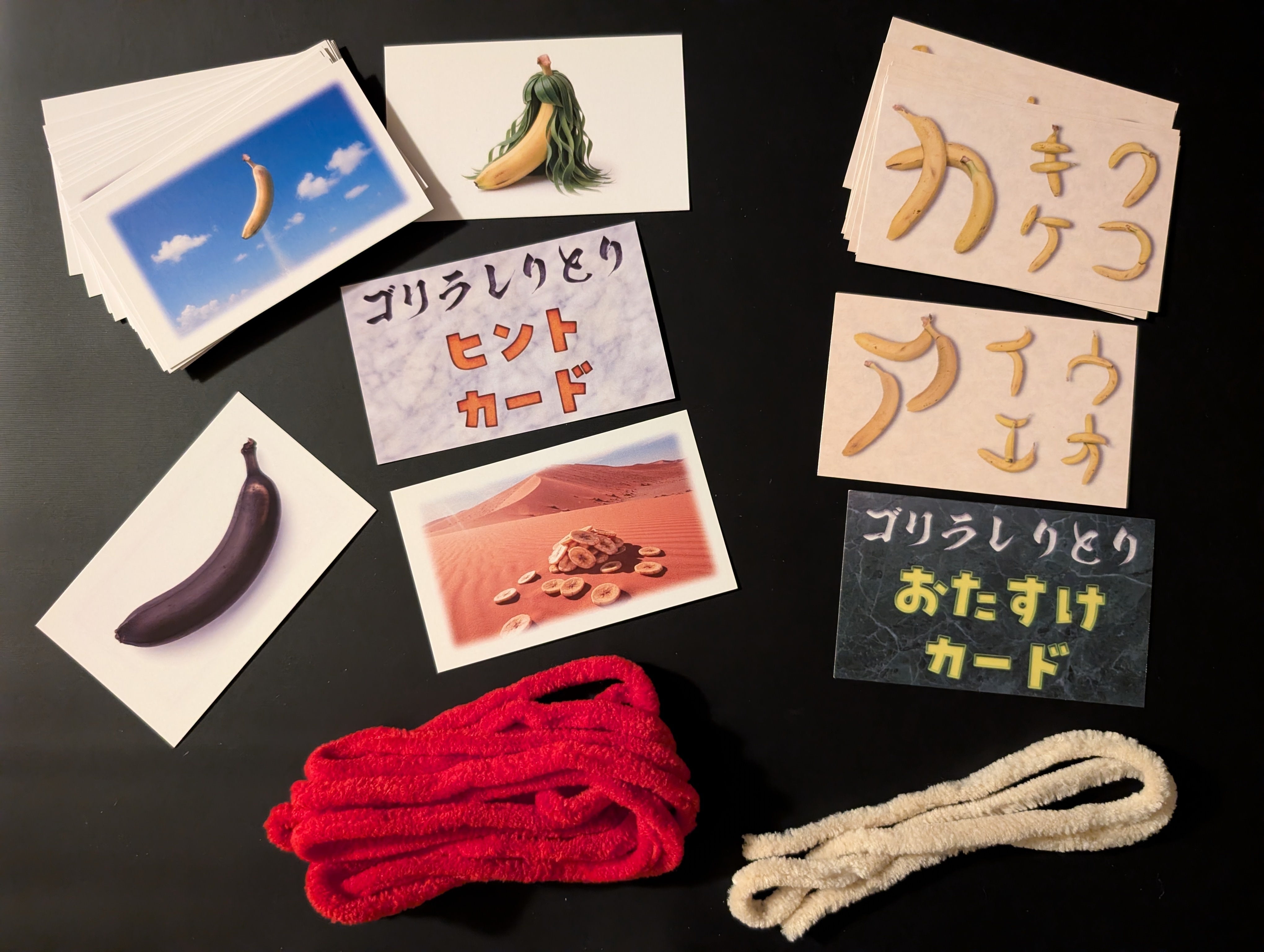 ヒモで絵を描き、ウホウホ声で語感を表し、カードで修飾する……言葉を喋らずしりとりを成立させるアナログゲームです。