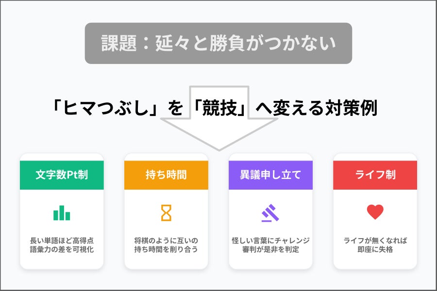 実に多くのプレイ経験者がいて、さらに語彙力も鍛えられるゲームなのに、一部の人しか日常的には遊ばないのがしりとりの現状です。原因としては、通常のルールでは延々と勝負がつかないこと、どの言葉を使ってよいか決まっていないことなどが挙げられます。