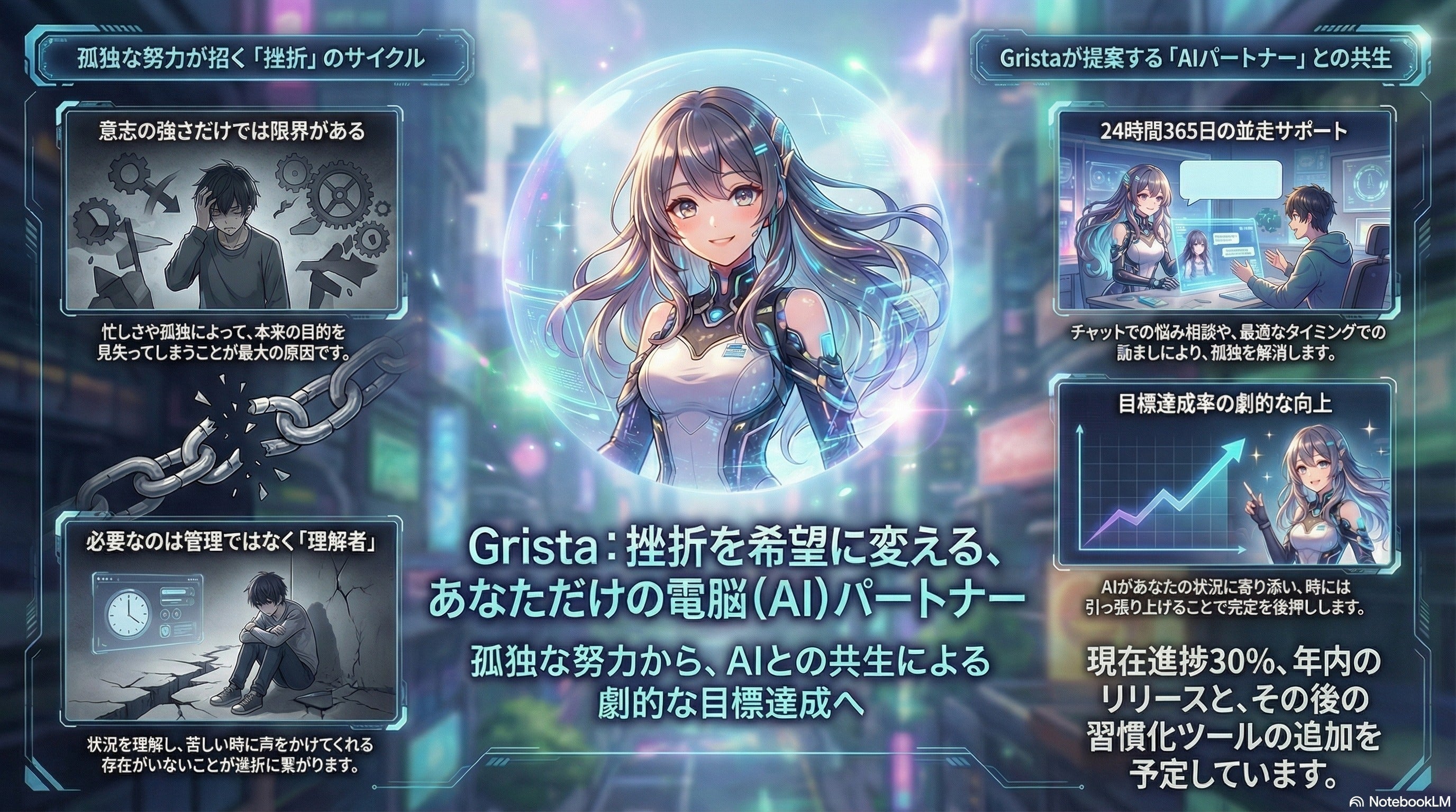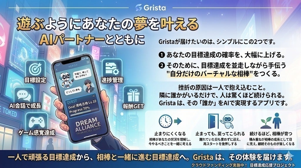「頑張りたい人のとなりで支え、応援するAIパートナ」『Grista 』を作りたいと考えています。