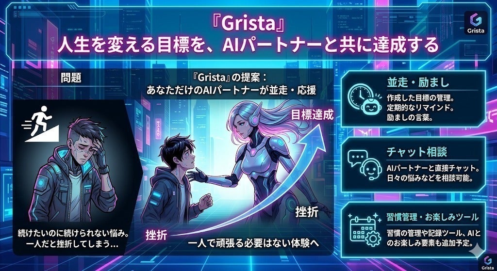 「頑張りたい人のとなりで支え、応援するAIパートナ」『Grista 』を作りたいと考えています。