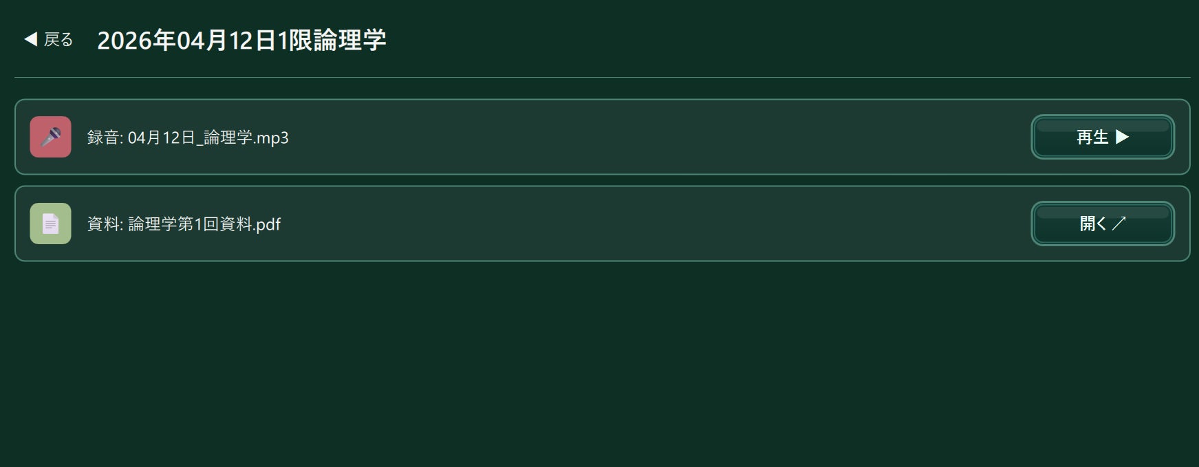 ここで資料の右にある「開く」を押したら、資料が開かれ、録音の右にある「再生」を押したら、