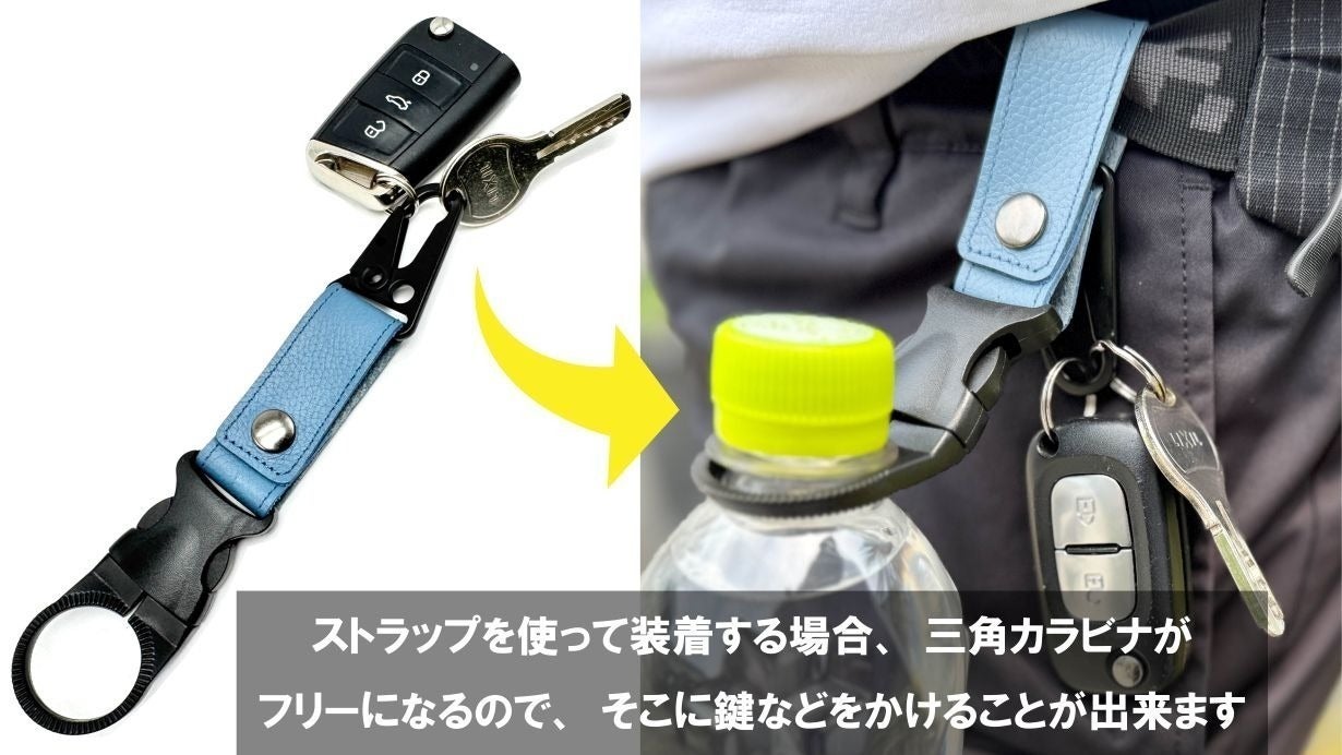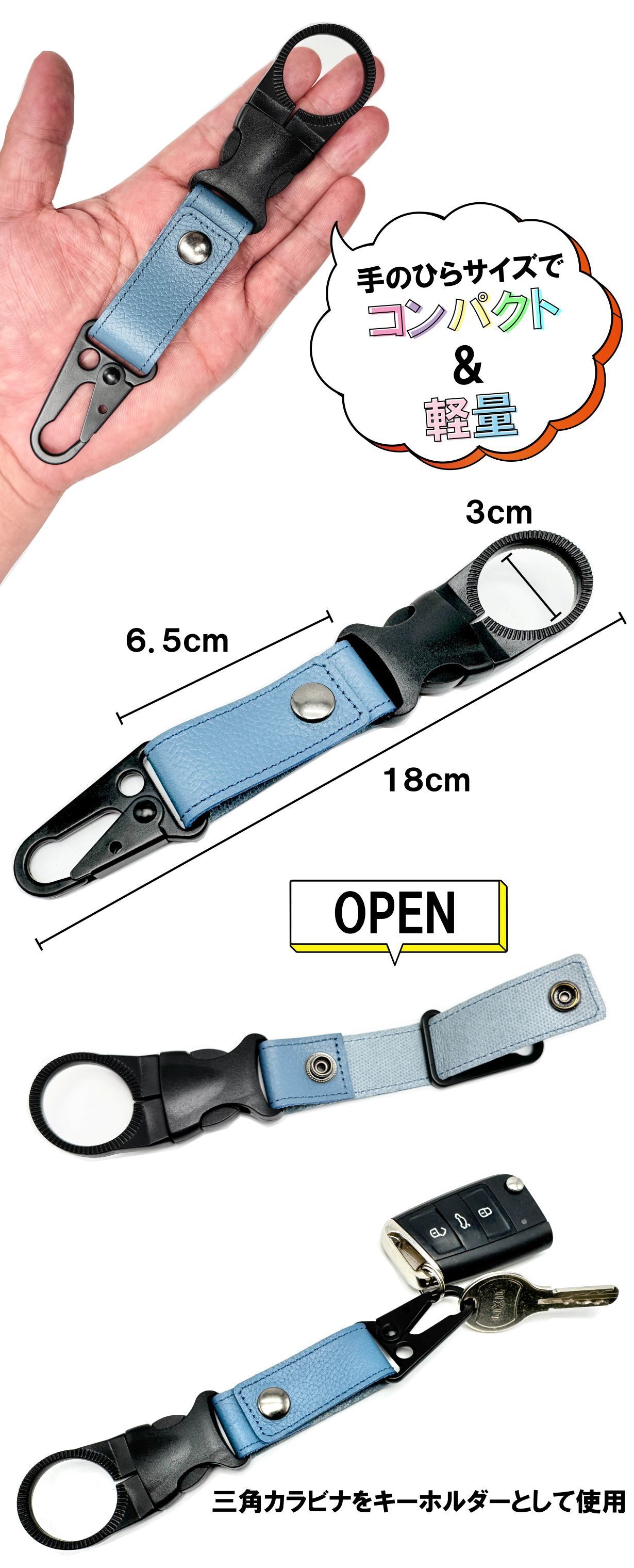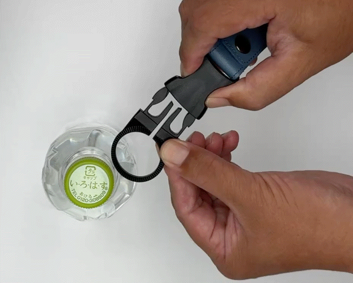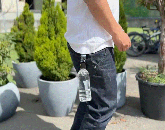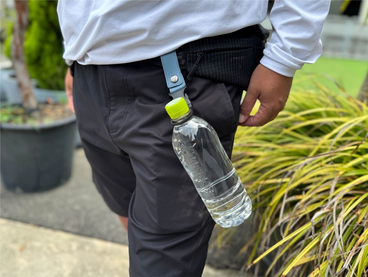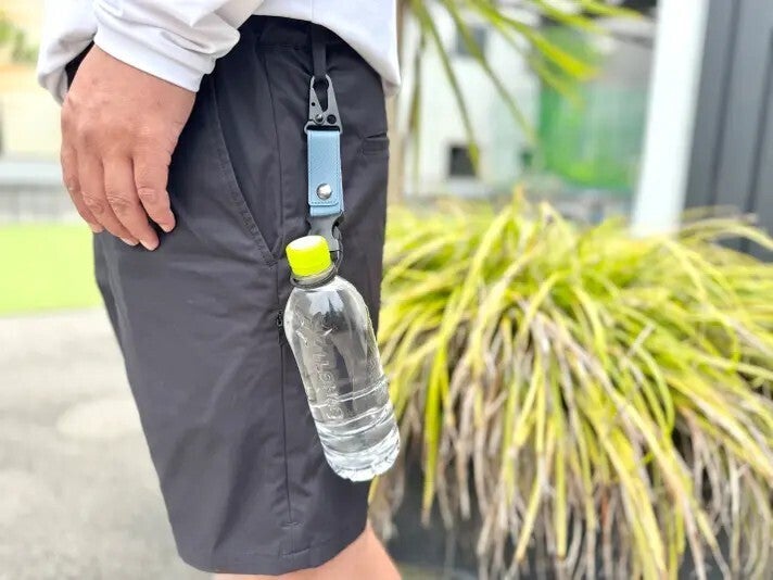 ペットボトルをキーホルダー感覚で腰から下げたり、鞄から下げたりできる、優れモノ。