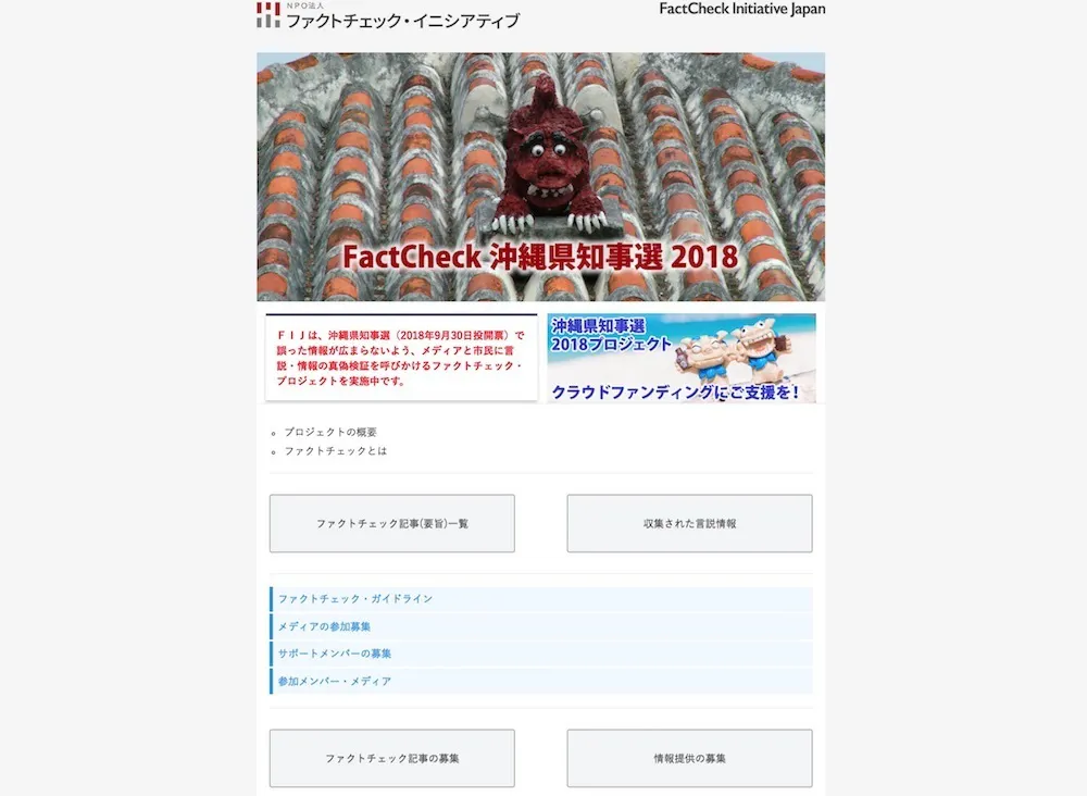 本日、沖縄県知事選の告示日を迎えました。本プロジェクトの特集サイトも正式にオープンしました。初日は1本目のファクトチェック記事を公開しました(ニュースのタネによる検証記事)。FIJが収集した、ファクトチェックの対象となり得る言説・情報も公開しています。ぜひ一度ご覧ください。