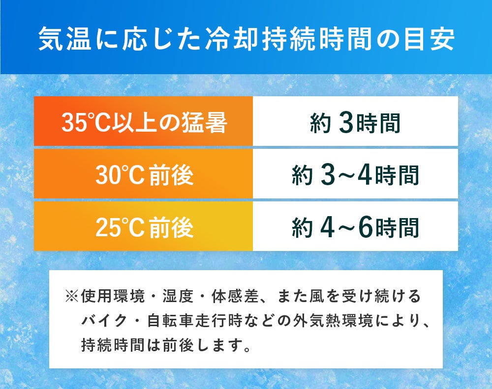 A:ご使用環境や気温、風の有無によって異なりますが、吸水後にしっかり水分を含ませてご使用いただくことで、屋外でも快適なひんやり感が持続します。真夏の炎天下では約3時間前後、比較的気温の低い環境では4~6時間ほど快適にご使用いただける目安です。