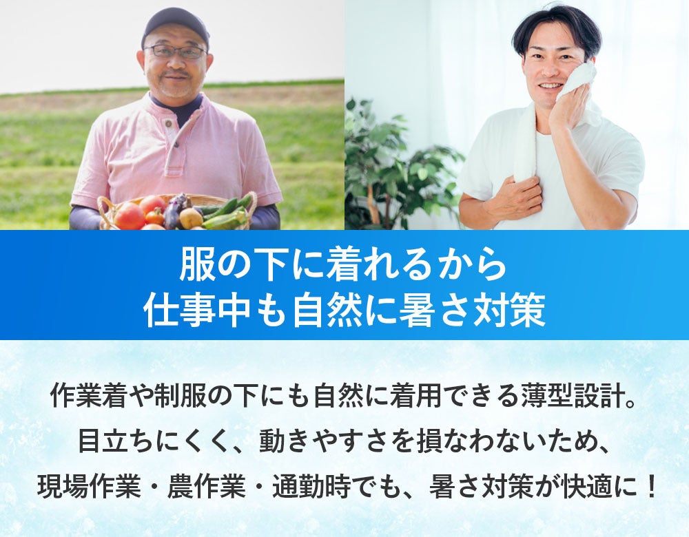 A:はい、炎天下での屋外作業、農作業、建設現場、倉庫作業、アウトドア、スポーツ観戦、通勤時など幅広いシーンでご活用いただけます。着るだけで暑さ対策ができるため、動きながらでも快適にお使いいただけます。