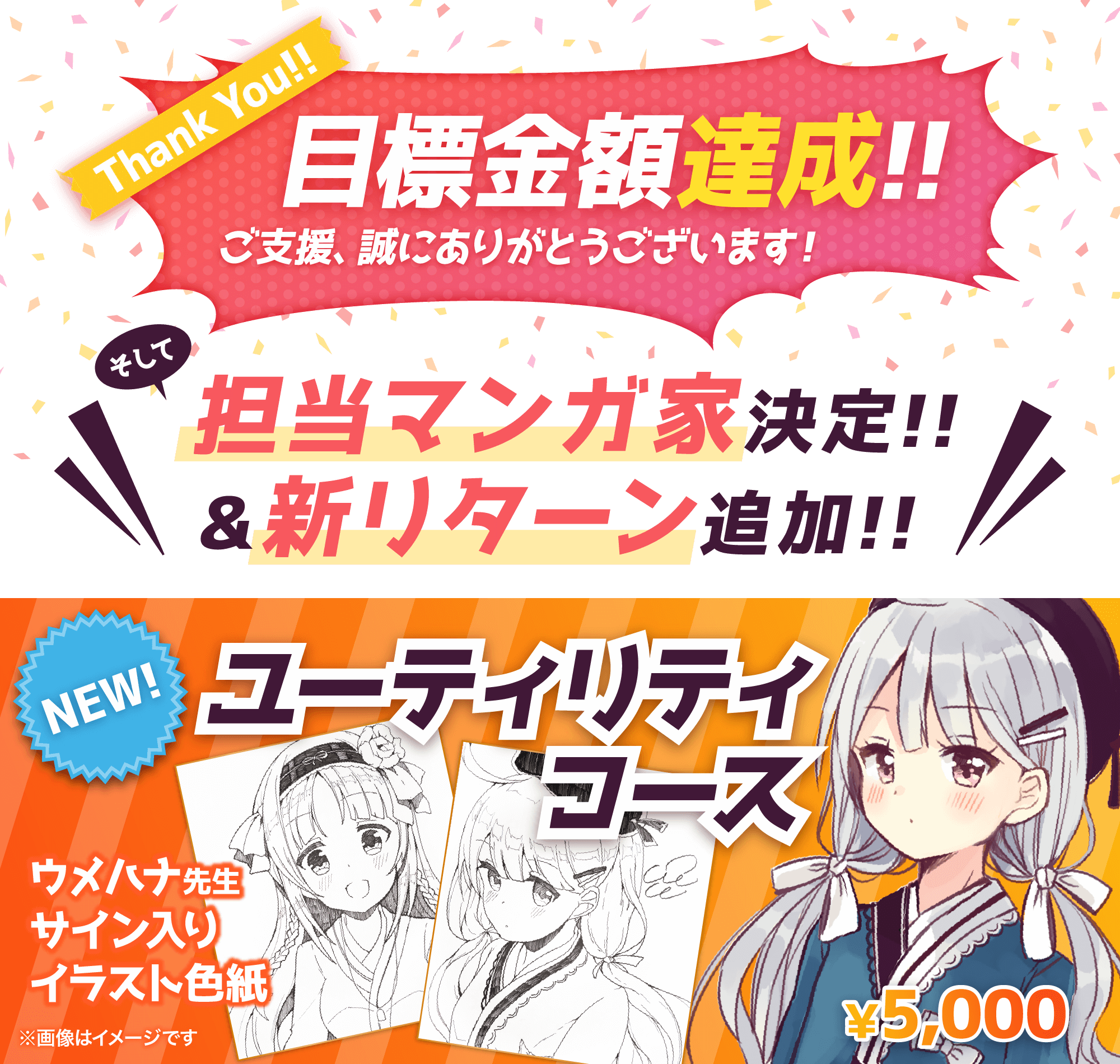 「初めまして、ウメハナと申します。経験の浅い私が皆様の期待に応えることが出来るか不安ですが、佐倉おりこ先生の可愛らしいデザインに、魅力的な設定のキャラクターを見ているうちに、自分の中で様々な妄想が膨らんできて、今は早く描いてみたい気持ちでいっぱいです。皆様に楽しんで頂けますように、精一杯に描いていきたいと思いますので、応援よろしくお願いいたいします!」