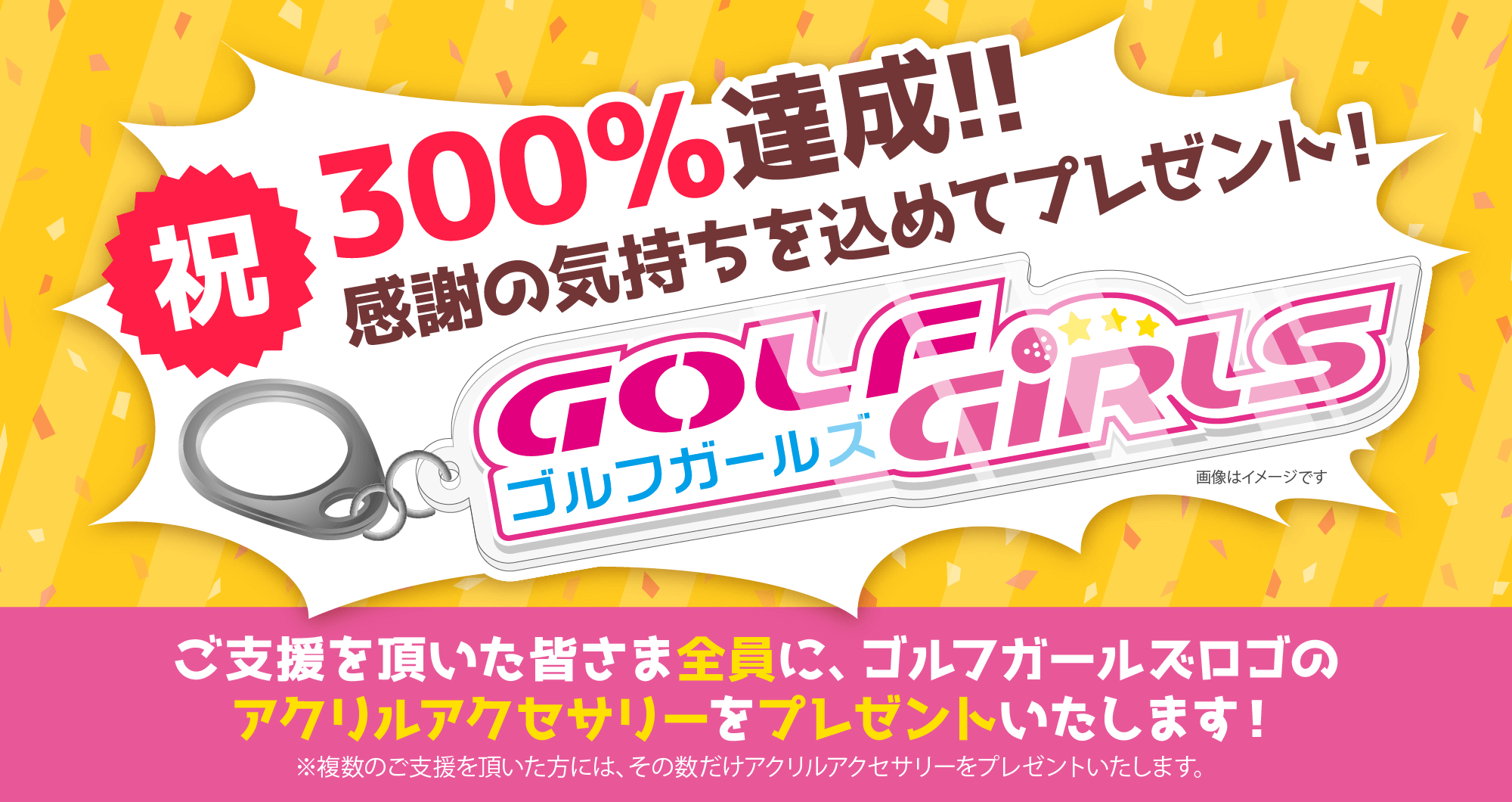 300%を達成いたしました感謝の気持ちとして、ゴルフガールズのアクリルアクセサリーを、ご支援を頂いた皆さまにプレゼントさせて頂きます。
