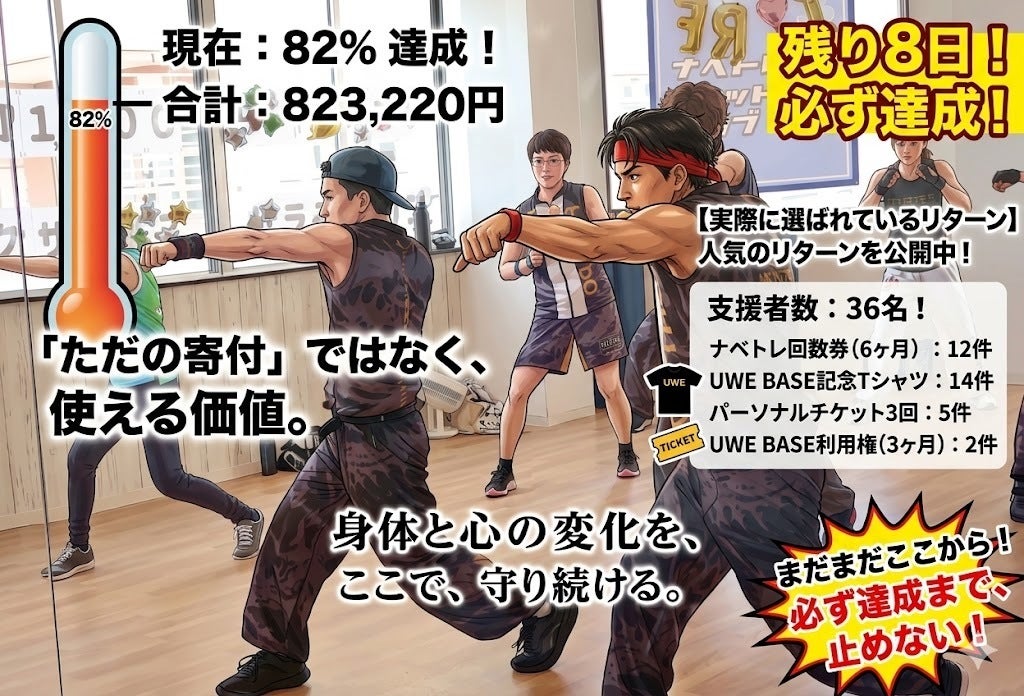 2026/04/22 15:12現在、823,220円、達成率82%まで到達しています!目標金額は1,000,000円。すでに36名もの方にご支援いただいています!本当にありがとうございます。今回のクラウドファンディングでは、「応援したい」というお気持ちだけでなく、実際に使えるリターンを選んでいただいていることが大きな特徴です。現時点で、特に動いているのはナベトレフィットネスクラブ島田Treasure回数券+支援、そしてUWE BASE記念Tシャツ+支援です。ナベトレフィットネスクラブ島田Treasure回数券+支援は、現在12件のご支援をいただいています。この回数券は、今回のクラウドファンディング特別仕様として、通常3か月の有効期限を、6か月に延長しています。「今後もナベトレに通いたい」「少し余裕を持って使いたい」という方にとって、かなり使いやすい内容になっています。そして、UWE BASE記念Tシャツ+支援は、現在14件のご支援をいただいています。このTシャツは、今回のプロジェクトに関わった証として、形に残るリターンです。なお、Tシャツについてサイズに関するお問い合わせを多くいただいていますが、現時点ではボディ選定・本デザインともに最終確定していません。今後、お店のオープンに合わせて、実際にお客様とも相談しながらボディ選定を進めていきます。最終発注前に、あらためてサイズをお伺いしますので、現時点では大体のサイズ感でお申し込みいただいて問題ありません。そのほかにも、・UWE BASE防衛メンバー上位支援 5件・渡邉ユウスケ パーソナルチケット3回+支援 5件・防衛支援 3件・UWE BASE 3か月利用権+支援 2件・スポンサー支援枠 1件(完売)と、すでに多くのリターンが選ばれています。この結果を見ても、今回のプロジェクトが「ただの寄付」ではなく、実際に使える価値と一緒に支援していただけていることが分かります。回数券は、今のナベトレをこれからも使い続けるために。Tシャツは、このプロジェクトに関わった証として。パーソナルや3か月利用権は、これから生まれるUWE BASEを実際に体感するために。それぞれの選択に、この場所を残したい、この場所を使いたい、この場所に関わりたい、という意思が込められているように感じています。そして、まだこれから動けるリターンもあります。・UWE BASE ビジター回数券4回+支援・渡邉ユウスケ パーソナルチケット1回+支援「まずはUWE BASEを体験してみたい」「一度しっかり見てもらいたい」という方には、こちらも選びやすい内容になっています。すでに選ばれているという事実そのものが、このプロジェクトの信頼と勢いを作ってくれています。残り8日。この流れを止めず、必ず達成まで持っていきます!渡邉ユウスケ もっと見る