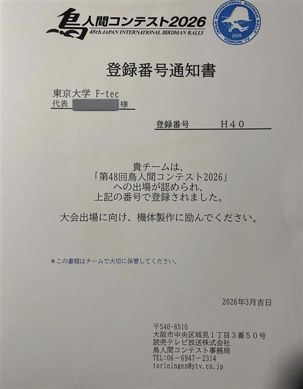 その結果、鳥人間コンテスト2026の審査を通過し、本番に向けた挑戦のスタートラインに立つことができました!
