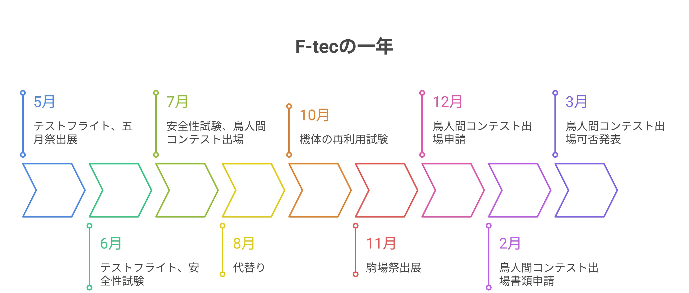 コンテスト後の8月には代替わりを行い、新体制へ移行したうえで、10月の機体再利用試験や11月の駒場祭出展へと活動をつないでいきます。さらに12月から翌年度大会に向けた準備を始め、2月に書類申請、3月に出場可否の発表を迎える流れです。