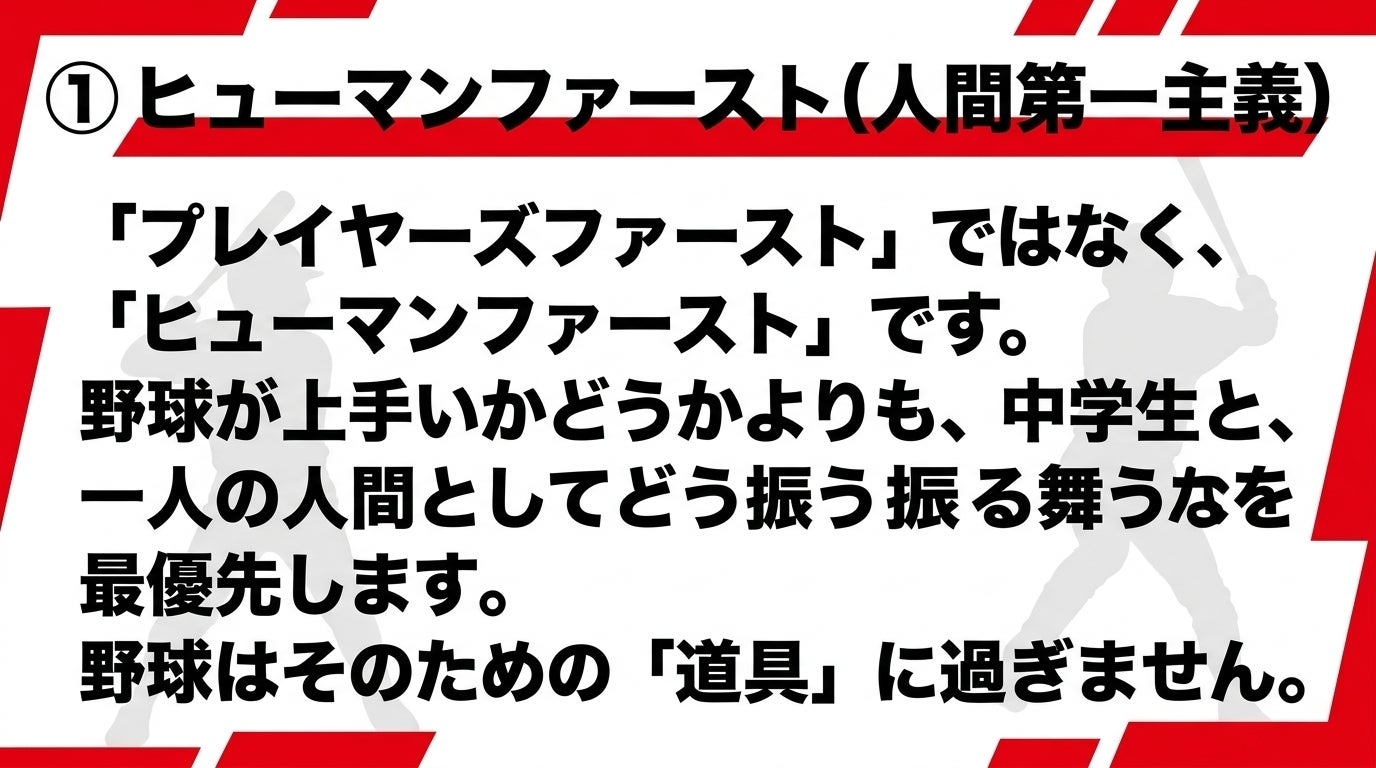 2026年4月、9年の時を経て、27名の一期生と共に、手賀沼ボーイズは新しく生まれ変わります。私は、これまでの野球界の常識を打ち破る「3つの指針」を掲げます。