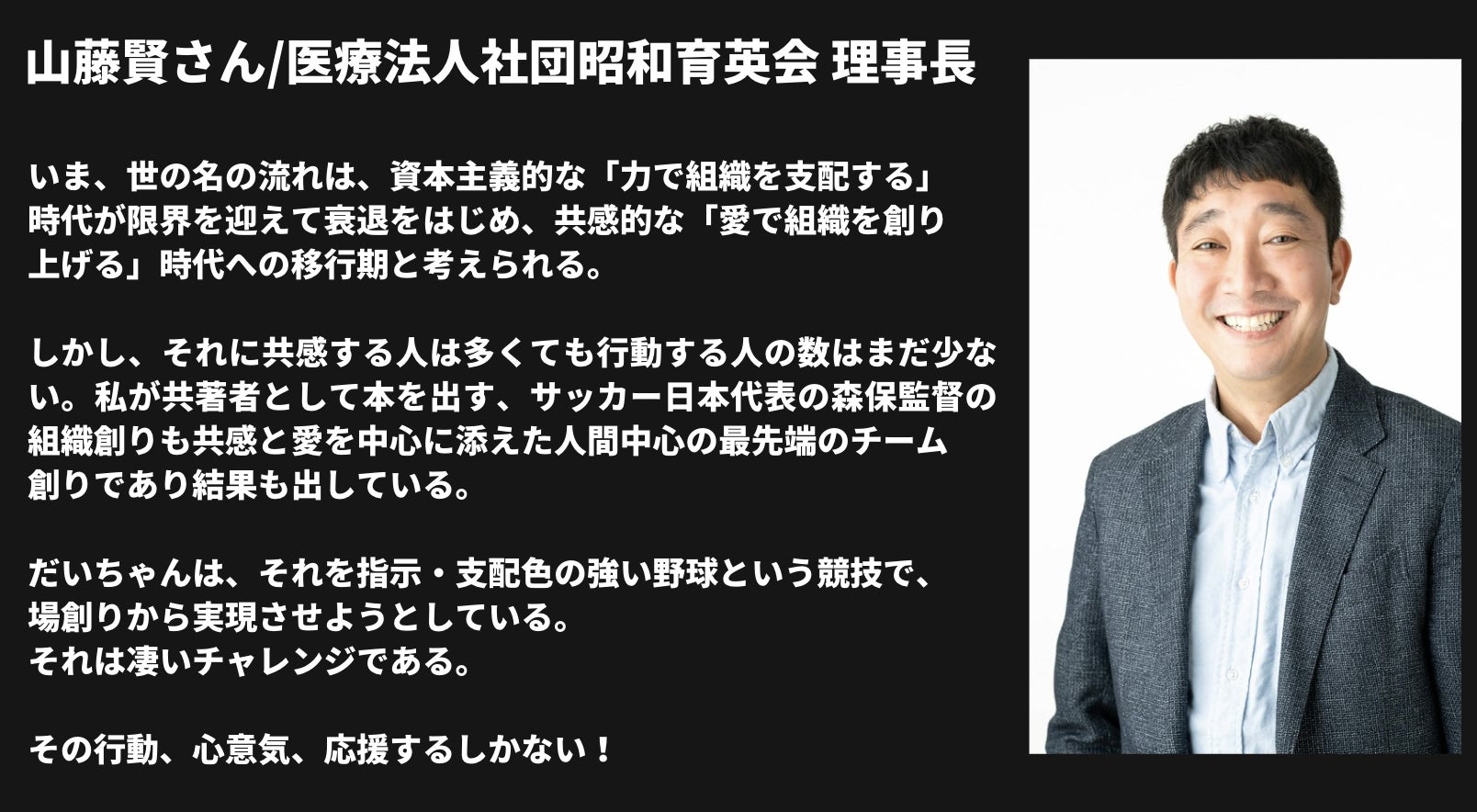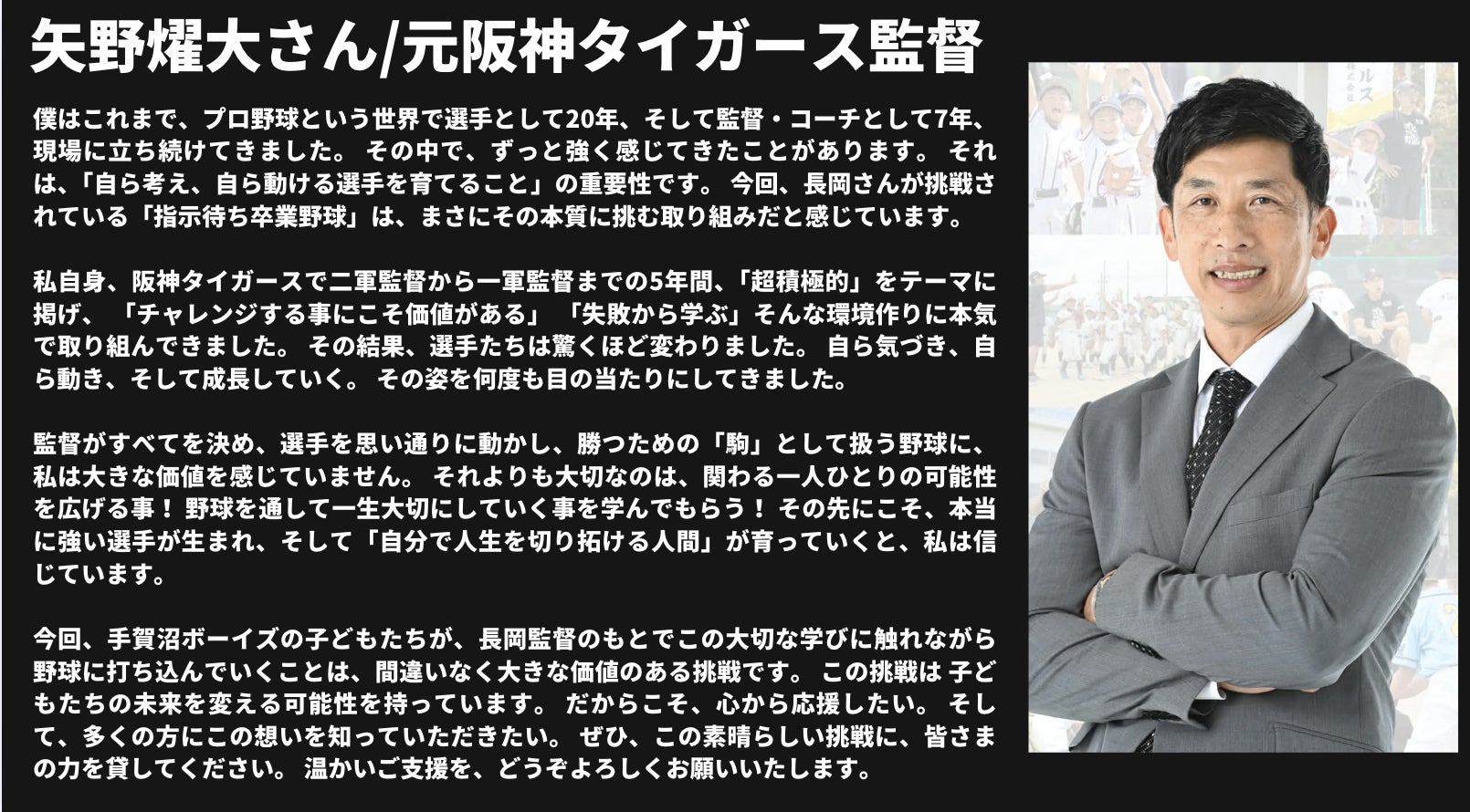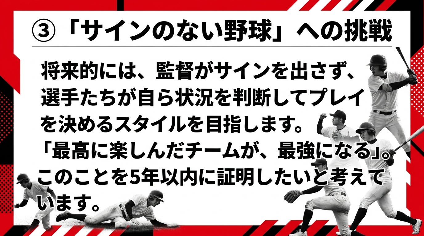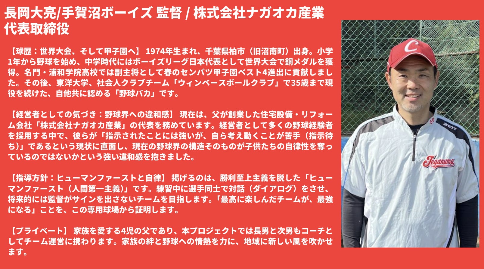 この野球界の「当たり前」をぶち壊したい。野球を通じて、社会に出ても自ら考え、周囲と対話しながら道を切り拓けるリーダーを育てたい。経営者として、またこれから生まれ変わる手賀沼ボーイズの監督として、その強い想いを抱いています。