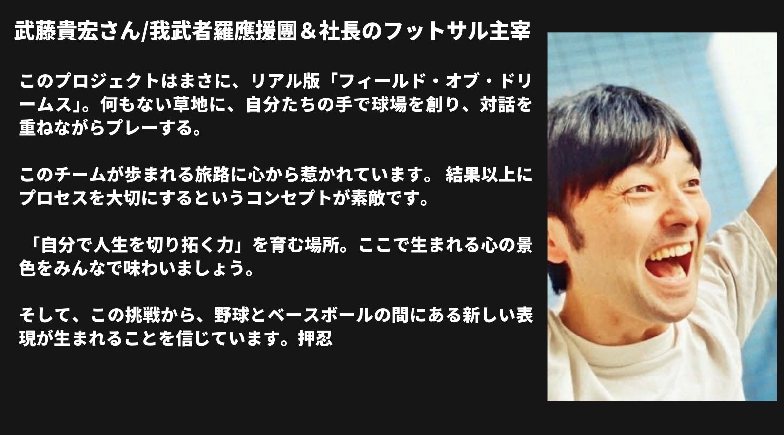 私の夢は、この球場からプロ野球選手が生まれることだけではありません。それ以上に、ここで「自律」と「対話」を学んだ子供たちが、将来、社会を動かすビジネスマンや経営者として活躍すること。それが私の最大の喜びです。