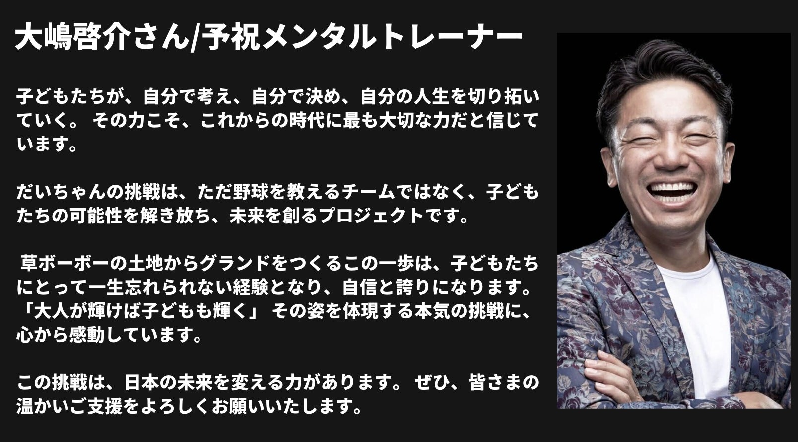 野球界に、そしてこの地域に、新しい風を吹かせたい。 子供たちの未来を創る「土壌」となるこの球場建設に、どうかお力を貸してください!