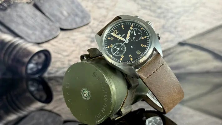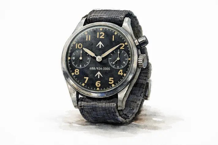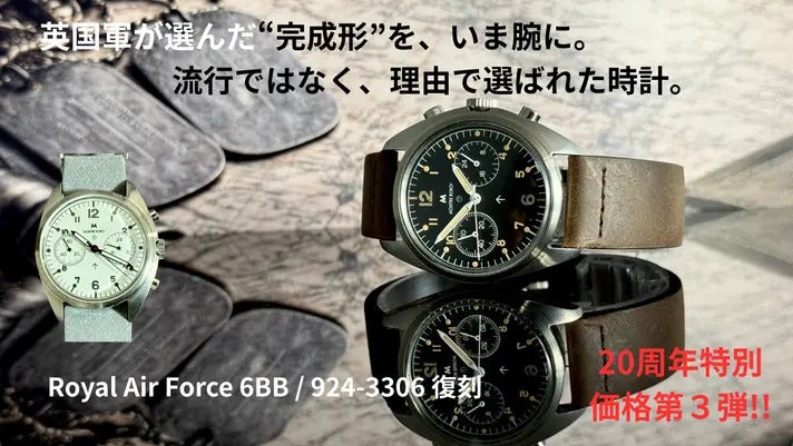英国軍が選んだ“完成形”を、いま再び。1970年代、**Ministry of Defence(英国国防省)**は、英国空軍(6BB)・英国海軍(0552)・少量陸軍(W10)のパイロットに支給される実戦で使える「理想的な軍用クロノグラフ」を求めました。求められたのは、装飾でも流行でもない。視認性・信頼性・整備性。それだけを突き詰めた結果、生まれたのが――後に “Fab Four” と呼ばれる英国軍クロノグラフです。その型番が6BB / 924-3306。英国国防省(MoD)が定めた仕様のもと、実戦で使うためだけに設計された時計です。