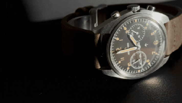 この時計は、“見せるため”ではなく**“使うため”に作られました。マットブラックの反射しない文字盤。一瞬で時間を読み取れるコントラスト直感的に操作できる2プッシャークロノグラフ軍用として信頼された左右非対称ケース