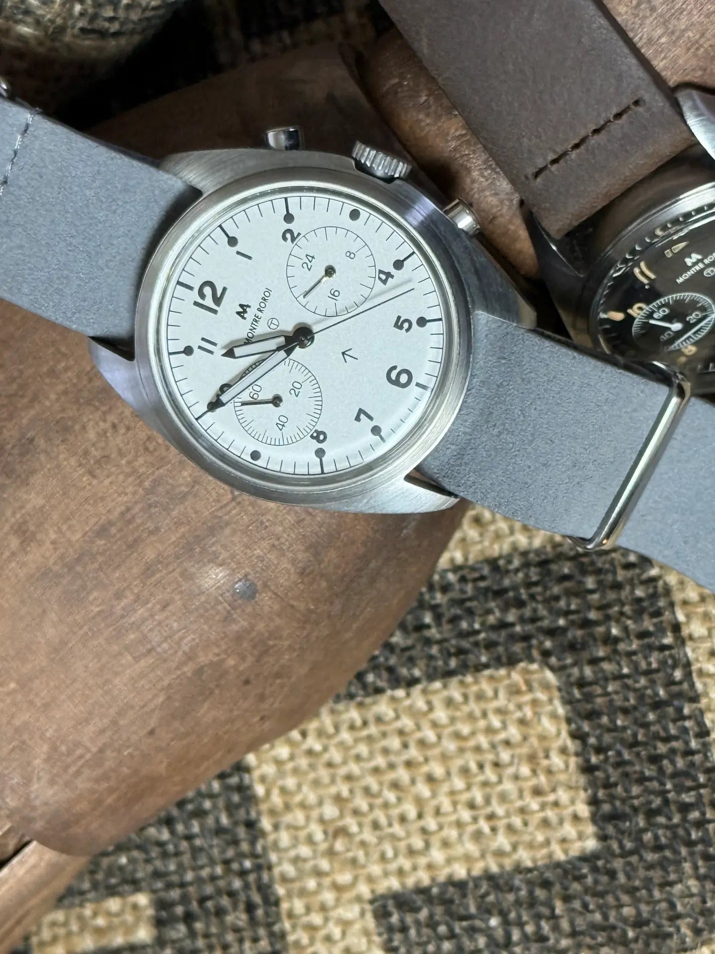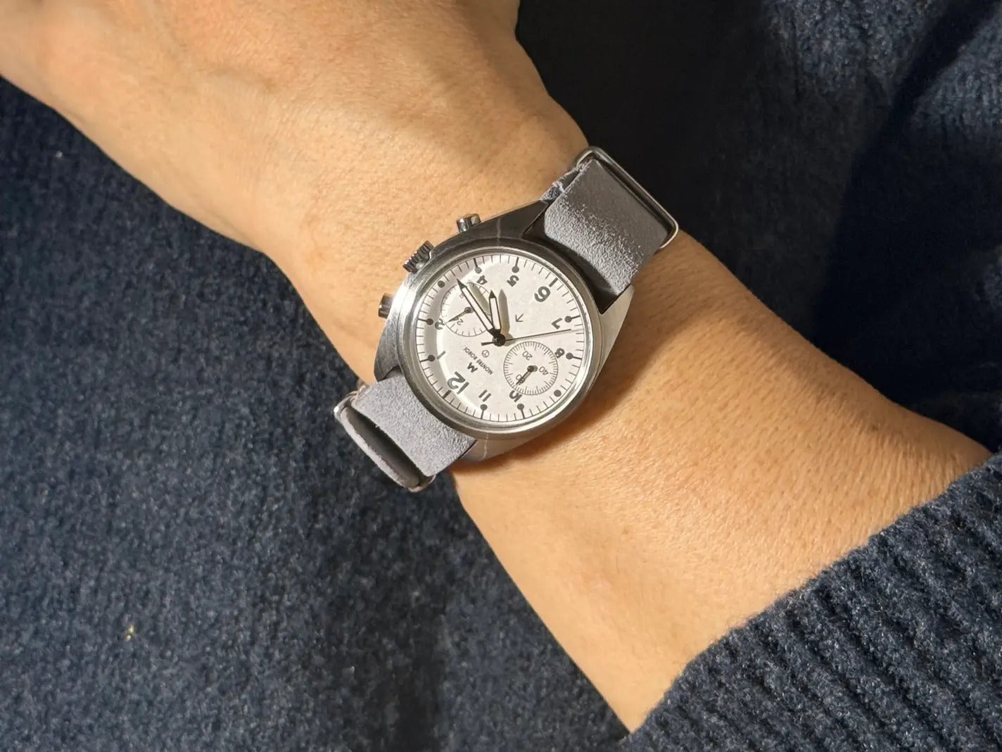― 私たちが、あえて選んだ「もう一つの完成形」このホワイトシルバー文字盤は、1970年代の英国軍官給クロノグラフに当時、存在しなかった仕様です。だからこそ、私たちはこの文字盤を「オリジナルの再現」だけではなく、ヴィンテージの思想を現代に翻訳する試みとして制作しました。現代の生活に自然に馴染むことも私たちの責任だと考えました。日常の光の中でスーツにも、カジュアルにも特別すぎず、しかし確かに違うそれが、このホワイトシルバーです。
