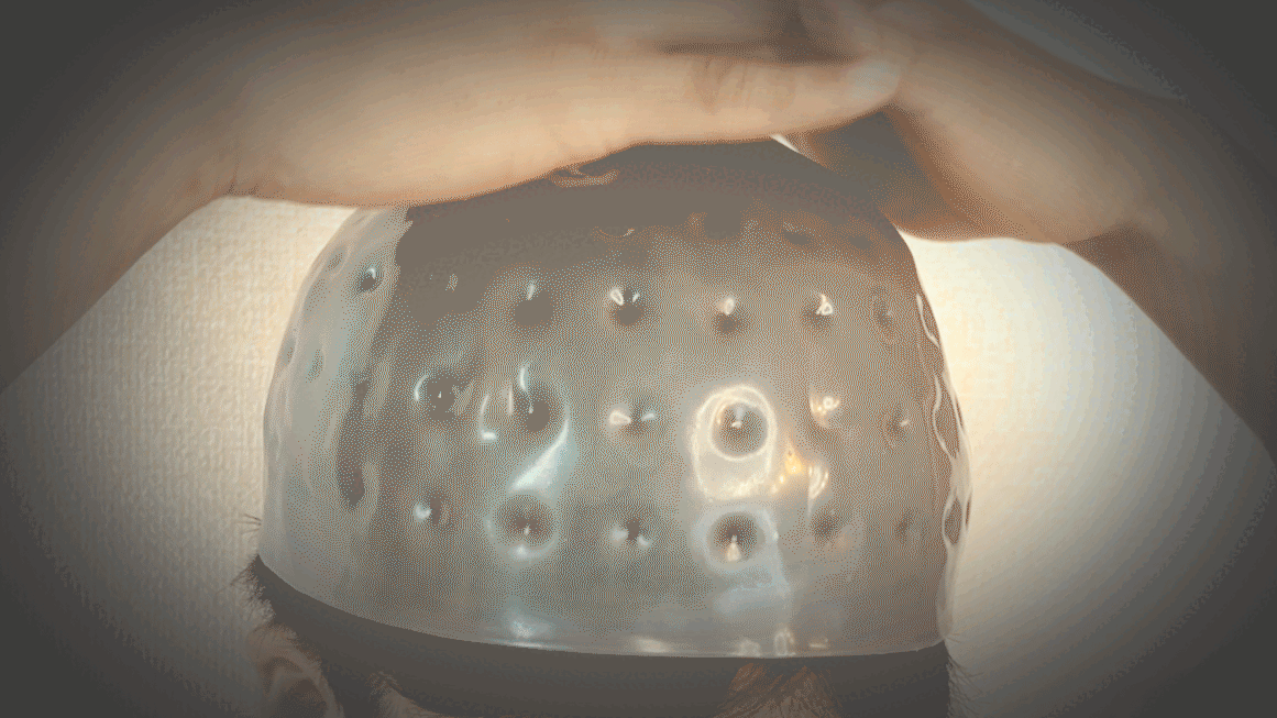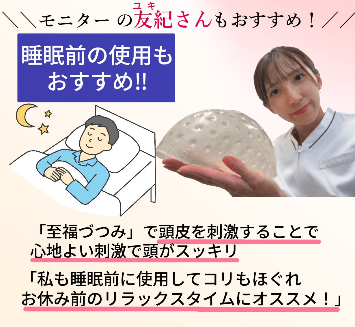リラックスヘッドスパ「至福づつみ」の内側には107個ものツボ押し用の突起が設けられています。上から軽く押すだけで頭皮を丸ごと刺激し「とても気持ちいい~!」ストレスも疲れも吹き飛ばしてくださいね。