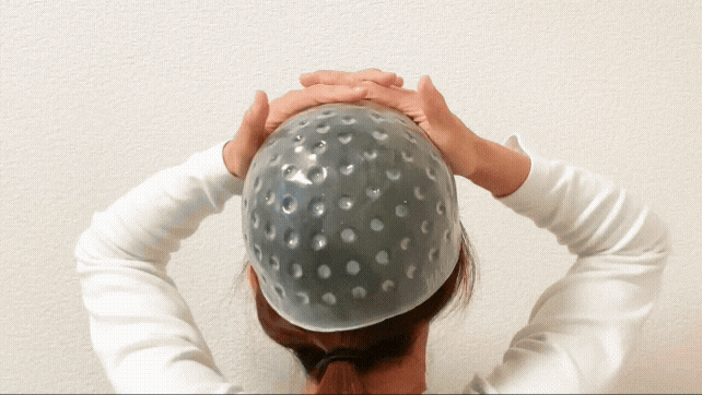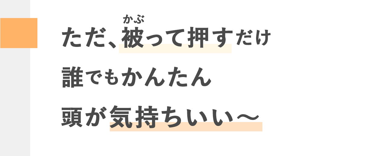 リラックスヘッドスパ「至福づつみ」は使い方もとてもかんたん。帽子のように頭にすっぽり被り、両手でグリグリ押すだけ。マッサージ師のようなコツも秘訣も要りません。