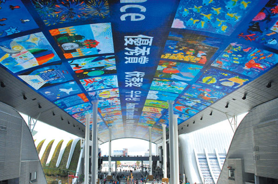 写真は、麗水国際博覧会のメイン施設「EXPOデジタル・ギャラリー」です、幅30m・長さ220m、高さ30mの巨大なLED画面が天井に設置されています。ラスベガスにも同じ天井での映像を映すストリートがあります。この施設を使おうという事になり、5分間の映像を日本が担当し制作しました。「EXPOデジタル・ギャラリー」での放映は、博覧会開催中毎日紹介され、多くの反響を頂きました。