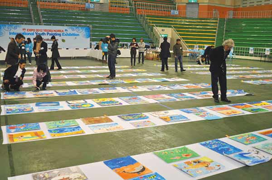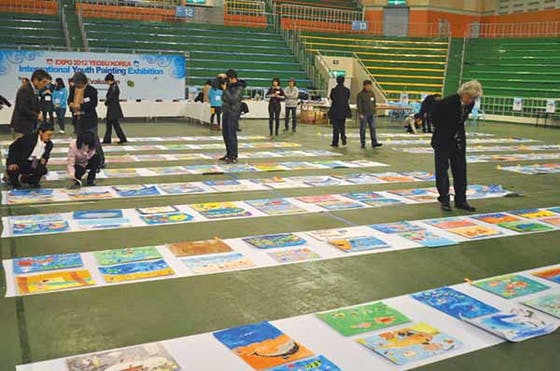 写真は2012年1月、韓国・ソウルで開催された「日中韓合同審査会」の一コマです。会場はソウル市内のKBS体育館です。各国で事前に選ばれた入賞作品を持ち寄り、日本・中国・韓国より各5名のアート関係者が審査員となり、各賞を決定しました。