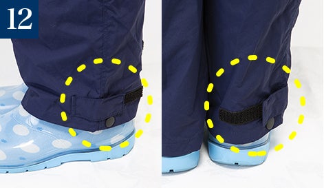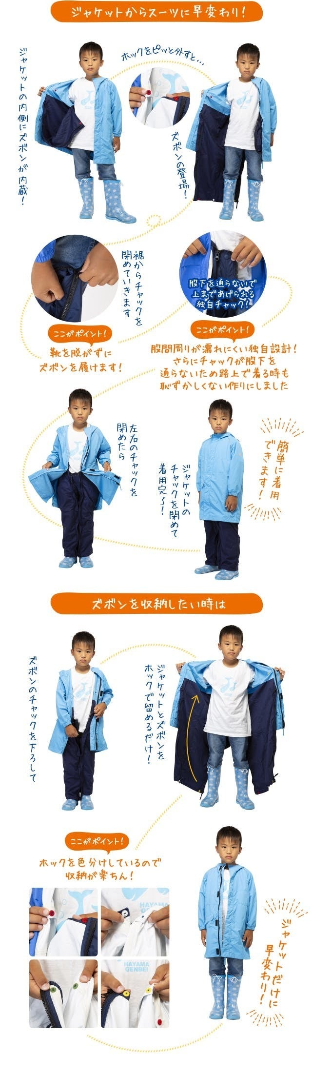靴を脱がずにズボン(内蔵)履けます!子供でも簡単に着れる2WAY防水レインスーツ