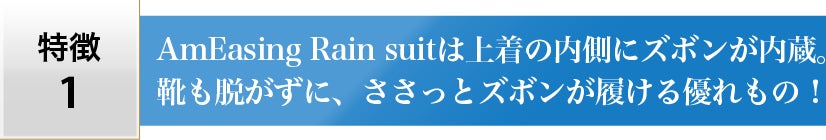 AmEasing Rain Suit(雨イージング レイン スーツ)はレインスーツブランド「RENSCIENCE」(レンサイエンス)が作る特許を取得したレインスーツです。NHKおはよう日本まちかど情報室で取り上げられた第一弾バイシクルシリーズをベースに、第2弾は子供用の機能を加え、開発しました。