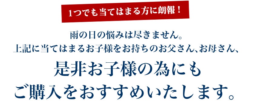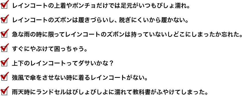 私たちはいつも雨の日に通学している子供を見てを憂鬱に感じていました。台風や強風の時に傘は使えない。レインコートを着てもズボンは濡れてしまう。ズボンが濡れたまま学校で授業を受けると勉強に集中出来ない。このような不便さを感じている親御さんはたくさんいらっしやるはずです。